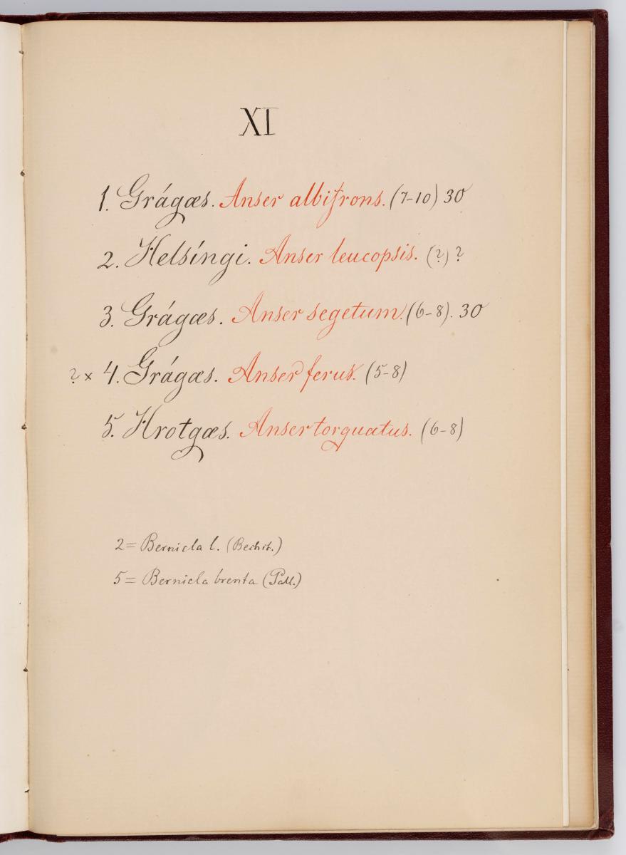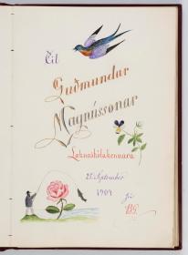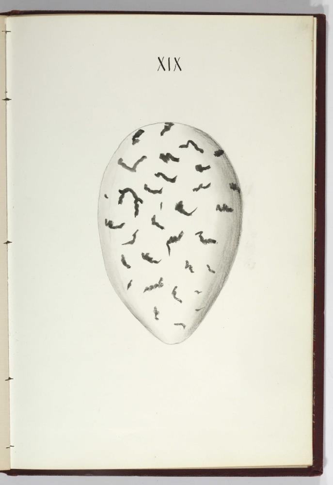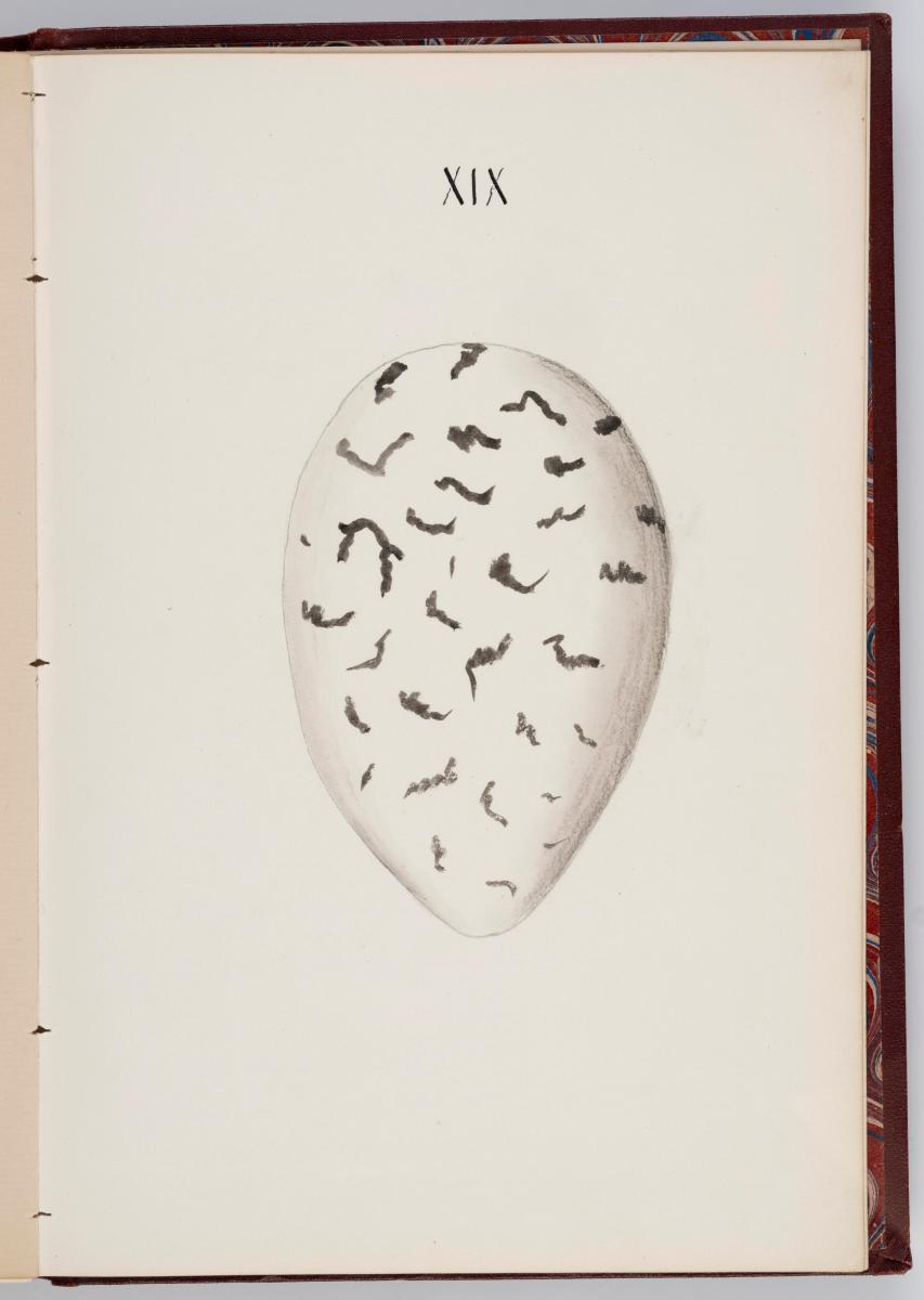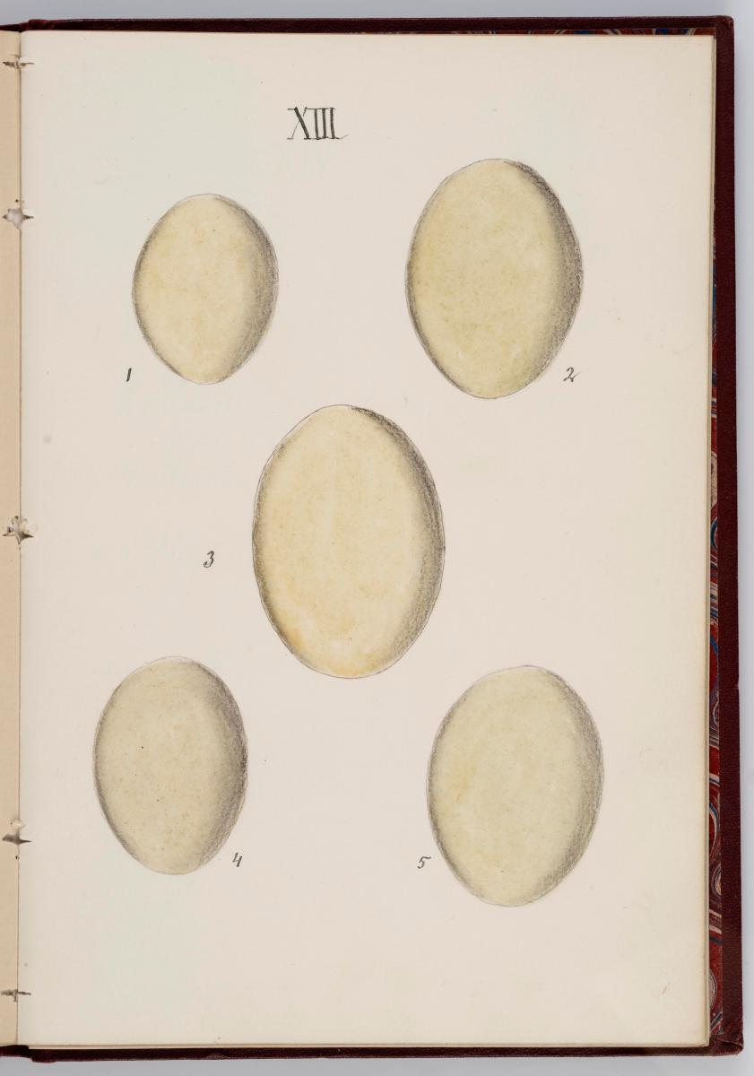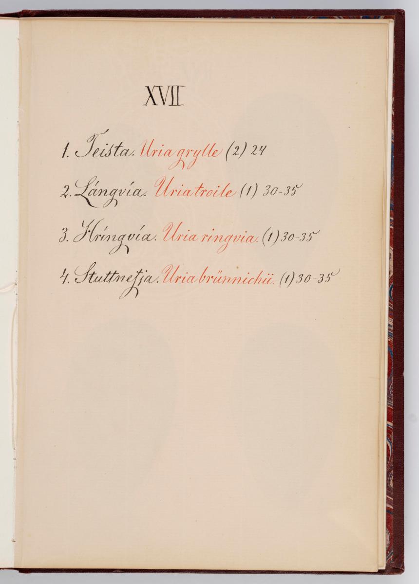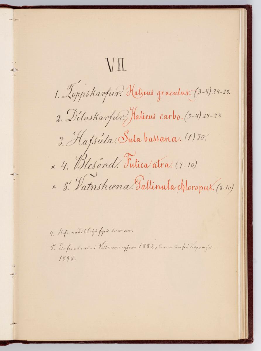 Bók, Íslenzk fugla-egg, ásamt eggjum aðkomufugla, teiknuð af Ben. Gröndal 1904, svo á titilblaðinu, sem er skrautritað. Á næsta blaði stendur, sömuleiðis skrautritað: Til Guðmundar Magnússonar Læknaskólakennara 25. September 1904 frá B.G. Á því blaði eru einnig skrautlegar litmyndir af fugli, þrílitri fjólu, rós og laxveiðimanni. Í bókinni eru 20 myndablöð með litmyndum af eggjunum og eru þær með eðlilegri stærð, en fyrir framan hvert blað er annað með skrá yfir fugla þá sem eggin eiga: eru fuglaheitin á íslenzku og latínu (með rauðu letri), þess getið, hve mörg egg hver fugl eigi og hve lengi hann sje að unga út: enn fremur eru þar athugasemdir um sjaldséða fugla hjer. Aptst er blað með ýmsum athugasemdum um bókina og um lit fuglaeggja. Bókin er bundin inn í rauðbrúnt ljerept. St. 25,5 x 17,8: þ. 1,3.