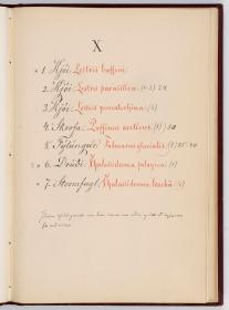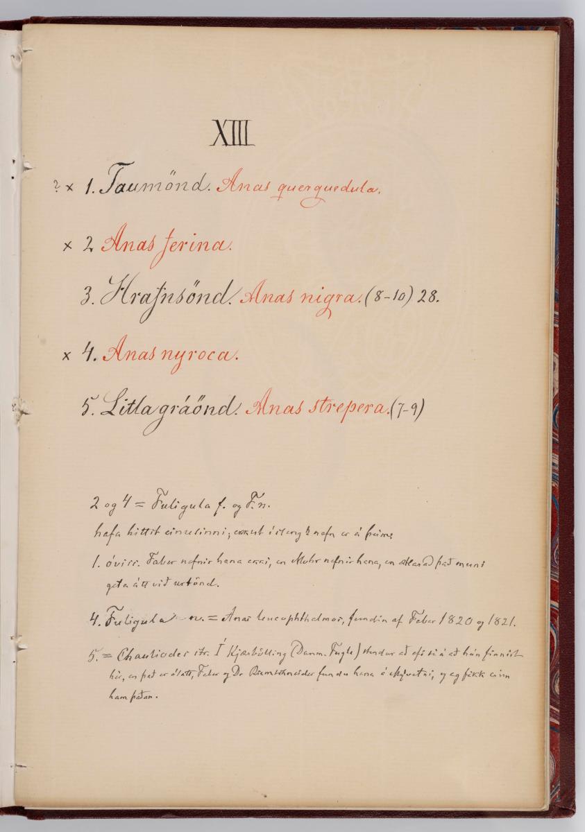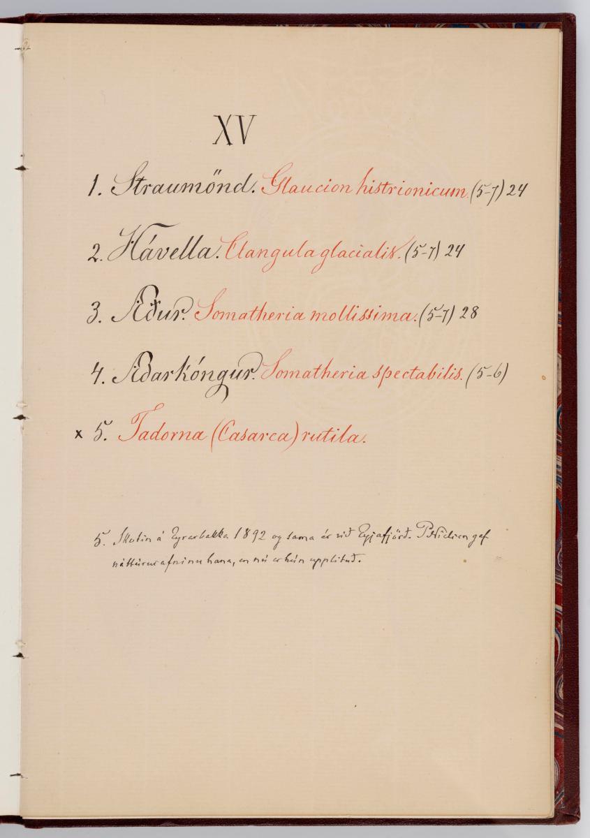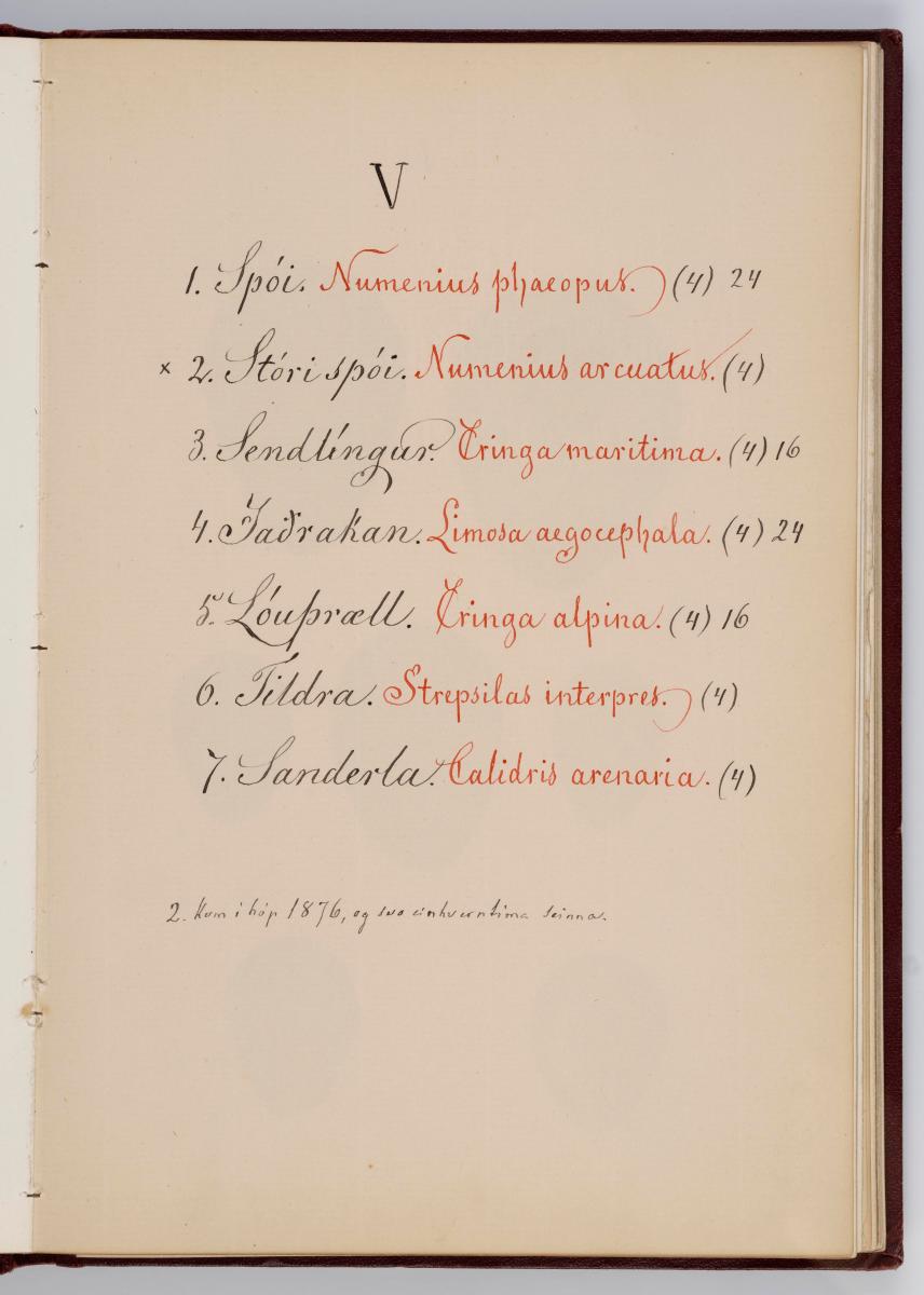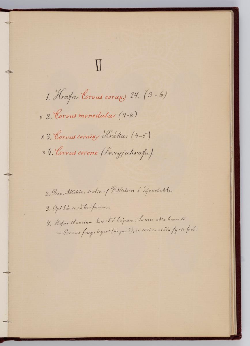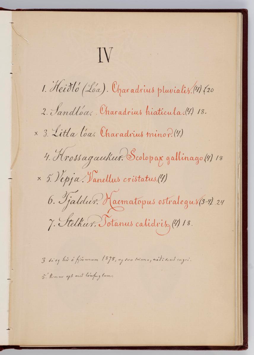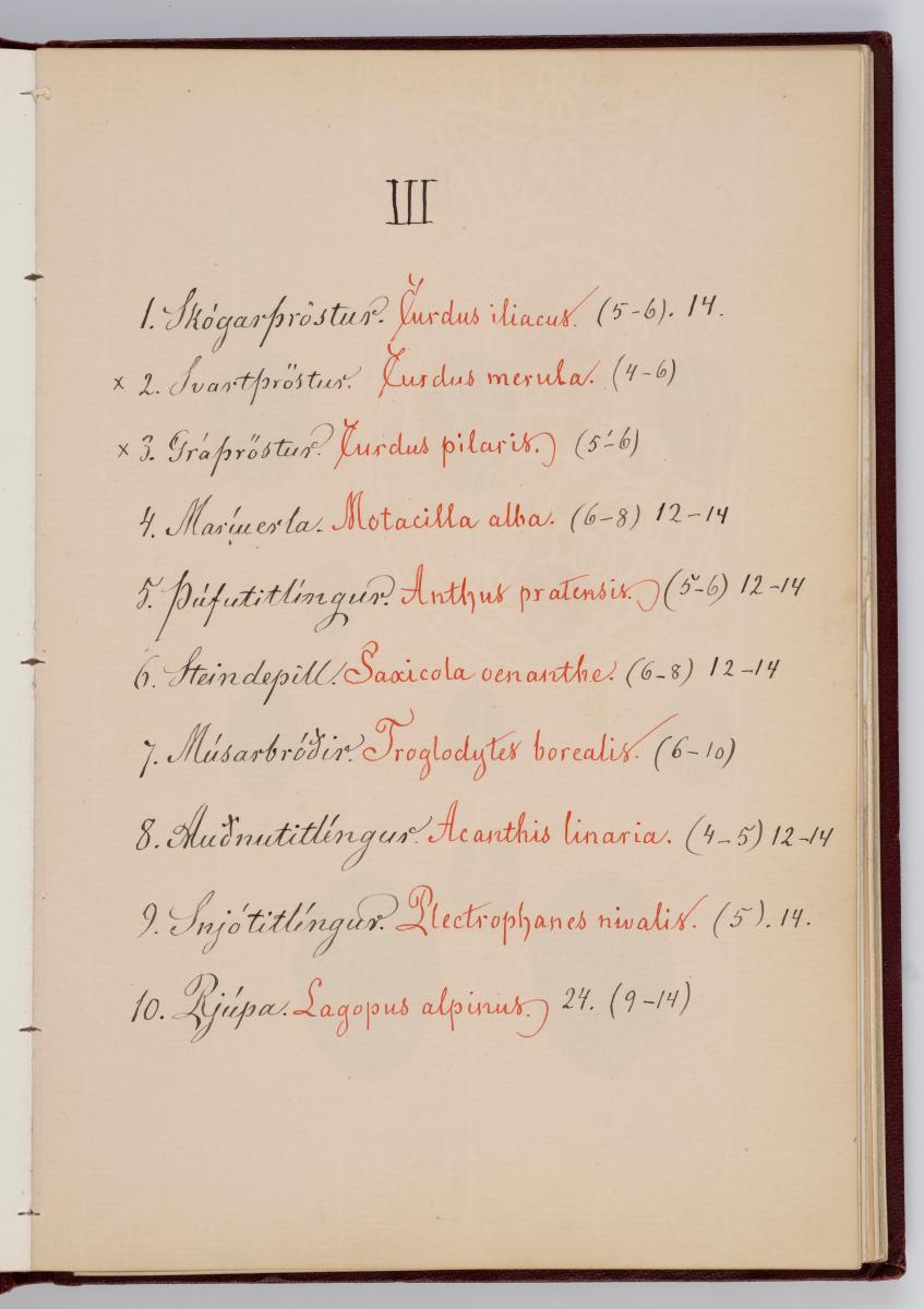 Bók, Íslenzk fugla-egg, ásamt eggjum aðkomufugla, teiknuð af Ben. Gröndal 1904, svo á titilblaðinu, sem er skrautritað. Á næsta blaði stendur, sömuleiðis skrautritað: Til Guðmundar Magnússonar Læknaskólakennara 25. September 1904 frá B.G. Á því blaði eru einnig skrautlegar litmyndir af fugli, þrílitri fjólu, rós og laxveiðimanni. Í bókinni eru 20 myndablöð með litmyndum af eggjunum og eru þær með eðlilegri stærð, en fyrir framan hvert blað er annað með skrá yfir fugla þá sem eggin eiga: eru fuglaheitin á íslenzku og latínu (með rauðu letri), þess getið, hve mörg egg hver fugl eigi og hve lengi hann sje að unga út: enn fremur eru þar athugasemdir um sjaldséða fugla hjer. Aptst er blað með ýmsum athugasemdum um bókina og um lit fuglaeggja. Bókin er bundin inn í rauðbrúnt ljerept. St. 25,5 x 17,8: þ. 1,3.