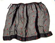 svörtu, þunnu efni með rauðum, vélútsaumuðum rósum á. Fylgir 1970:48.