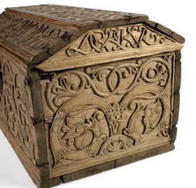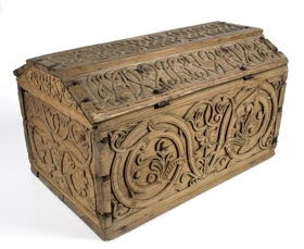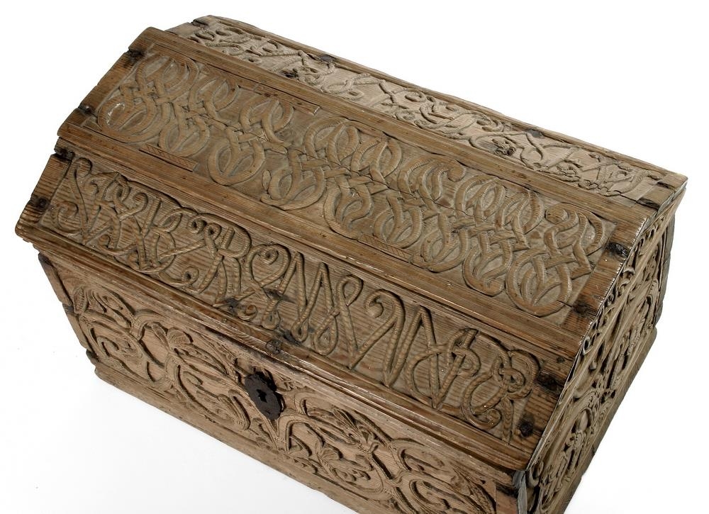 Kistill með burstaloki, líkt og brotið þak, og þar á skornir eins konar rósastafir, enn óráðnir. Á hliðum og göflum eru grannir rósastrengir, allt skorið upphækkað frá grunninum. Frá síðari hluta 18. aldar.