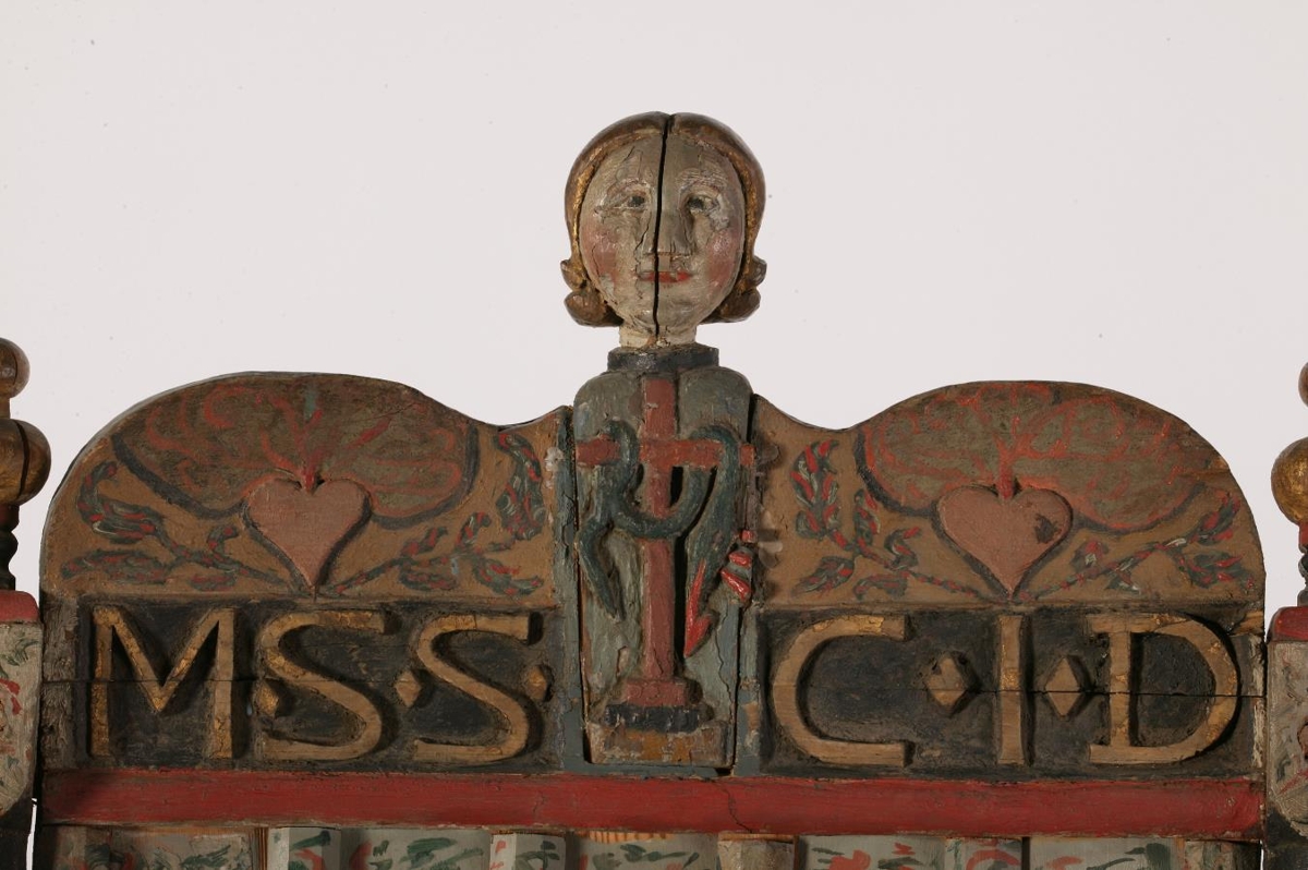 hjörtu, bakið er á hæð uppá höfuð 2 al. 7 þuml. allir fætur stólsins, þversláin