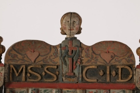 milli, ofaná þverfjölinni er mannshöfuð skorið, þar niðr frá er skorin