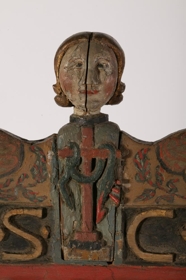 milli, ofaná þverfjölinni er mannshöfuð skorið, þar niðr frá er skorin