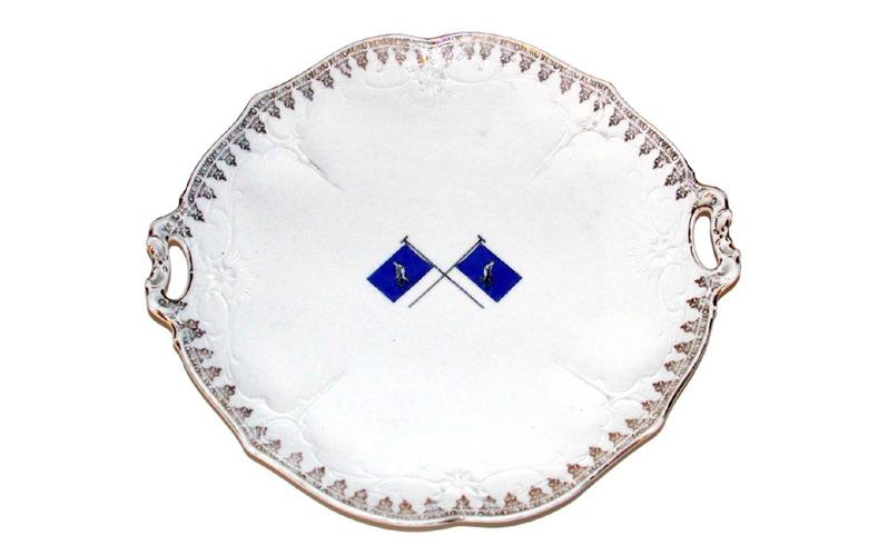 úr hvítu postulíni með skrautgyllingu og tveimur fálkafánum í miðju. Á