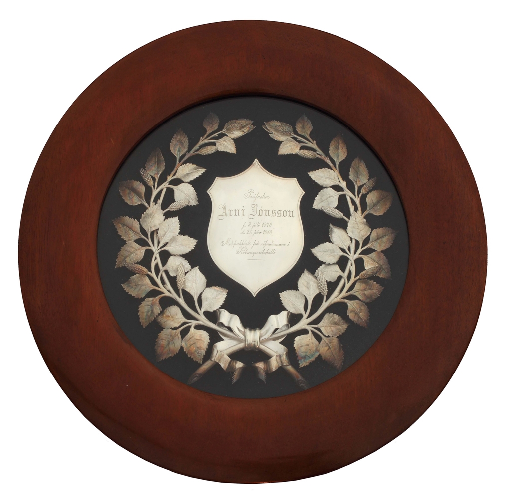 Minningarskjöldur sem gerður er til minningar um föður gefenda, sr. Árna Jónsson á Skútustöðum. Er skjöldur þessi úr silfri, í kringlóttum og kúptum mahoní ramma, og haft gler yfir. Umgerðin 6 cm á breidd og þykkt 3 cm. Í baki er plata úr tré, ánegld, sem myndar grunn, hún er dregin blásvörtum flóka, en skjöldurinn festur í miðju og ofarlega, og liggja umhverfis hann tvær greinar úr silfri, laufgarðar og með aldrinum. Letrað er á skjöld: "Prófastur/Árni Jónsson/f.9.júlí 1849/d.27.febrúar 1916/Með þakklæti frá söfnuðinum í / Hólmaprestakalli." Ramminn gljáborinn að framan og við brúnir. Brúnn pappír límdur yfir plötuna á baki. Efst er þar lítil lykkja úr kopar, skrúfuð föst. Gert hefur Jónatan Jónsson, gullsmiður. Silfrið í greinunum hefur dökknað nokkuð, örlítið sér á gljáhúð ramma.