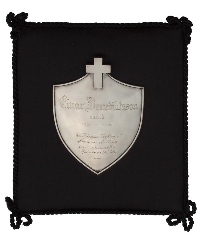 Minningarskjöldur um Einar skáld Benediktsson, gerður af silfri, í lögun sem sporðskjöldur með kúptum fleti, en kross, einfaldur og sléttur, er á toppi skjaldarins. Hæðin er 19,5 cm með krossinum, en mesta breidd 14 cm. Á skjölinn er grafið: Einar Benediktsson / skáld / 1864-1940 / Frá Björgvini Vigfússyni / eftirmanni skáldsins / sem sýslumaður / í Rangárvallasýslu. Stimpill gullsmiðsins er ÞÁJ, þ.e. Þorgrímur Á. Jónsson, starfandi hjá Árna B. Björnssyni. Skjöldurinn er festur á svart silki, sem saumað er um ferhyrnt spjald og troðið á milli, að öllu líkt og nr. 23/10 '39.