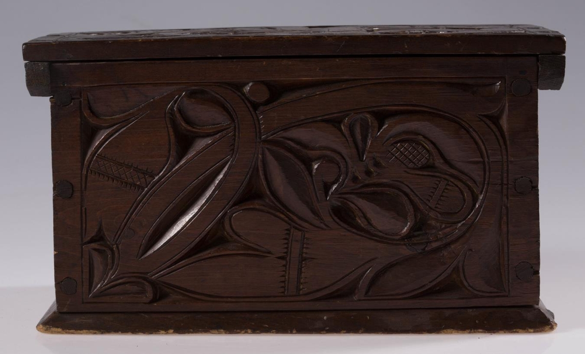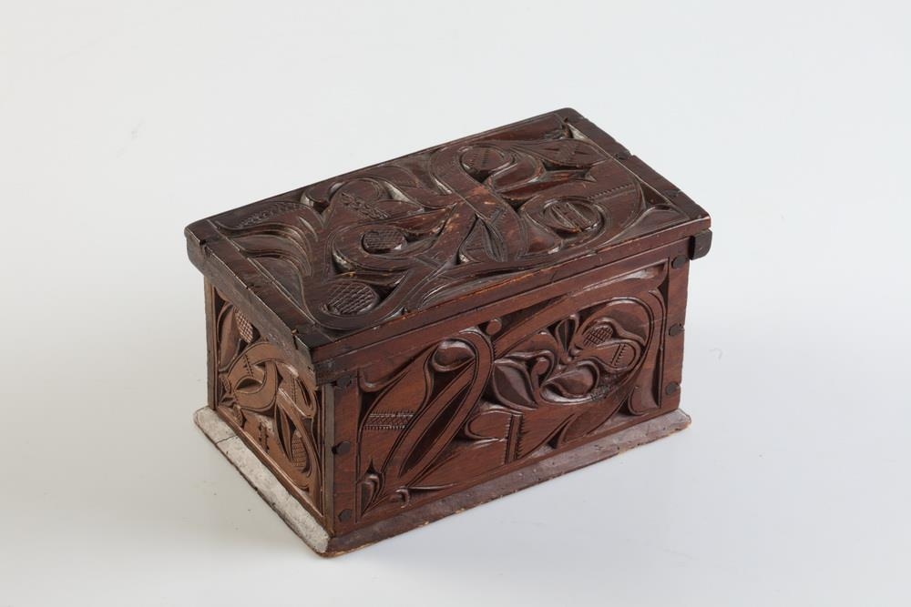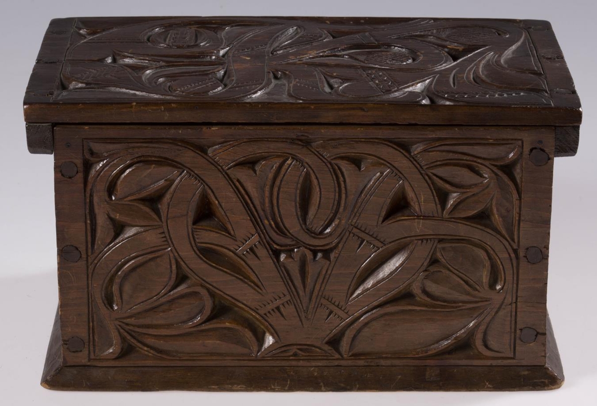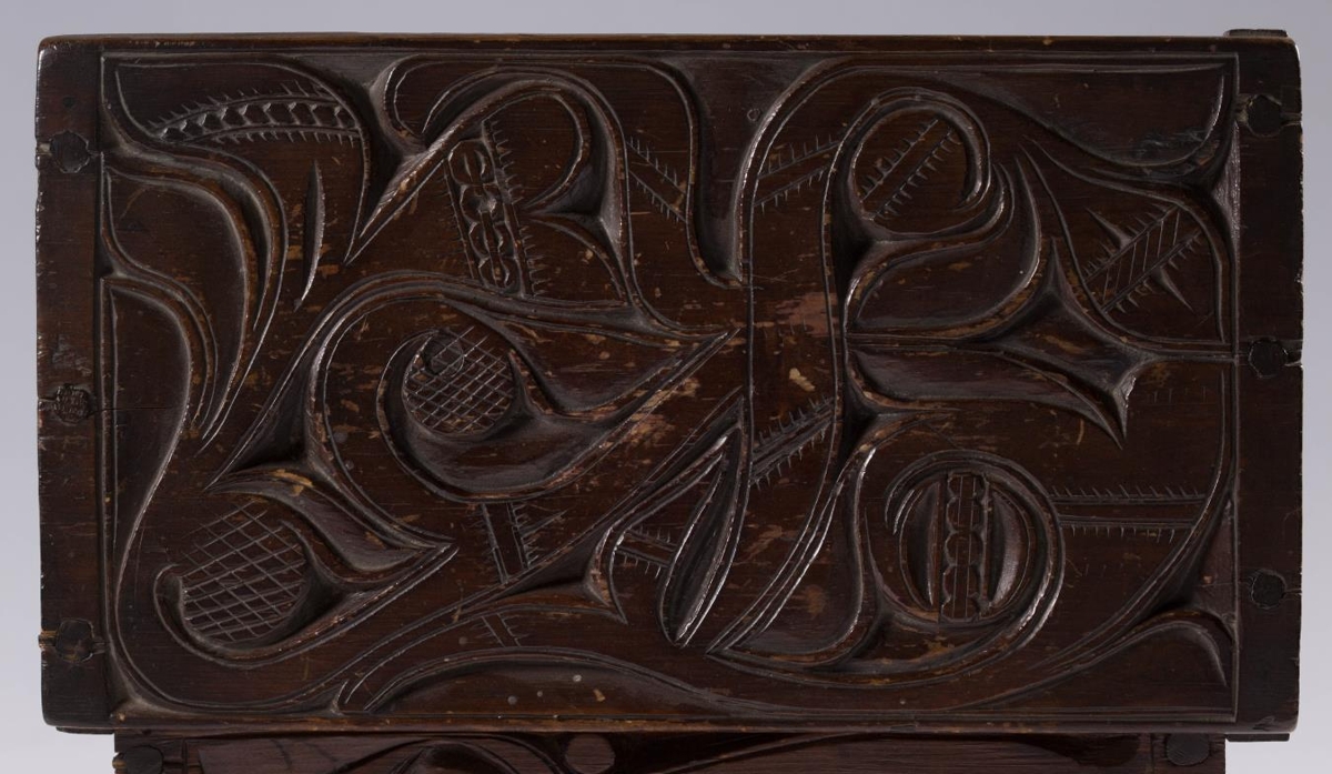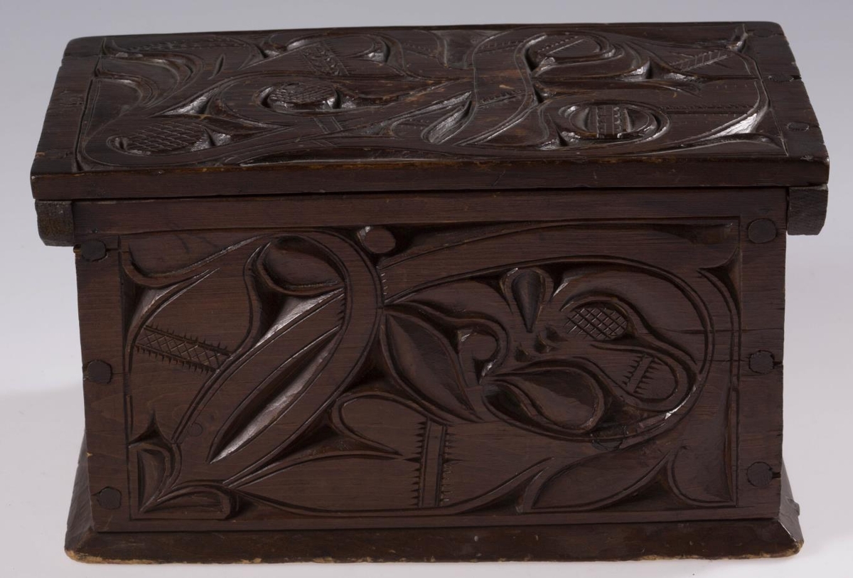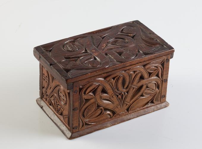 Útskorinn ferhyrndur kistill negldur með tréfleygum. Hliðarnar eru negldar ofan á botnfjölina, lokið fellur ofan á og er á hjörum. Með endum loksins eru negldar smáspýtur sem falla út yfir gaflana. Kistillinn er skreyttur á öllum hliðum og á loki og minnir munstrið á jurta- eða blómamynstur. Munstrið framan á er samhverft (symmetriskt). Kistillinn er málaður með brúnni lakkmálningu.