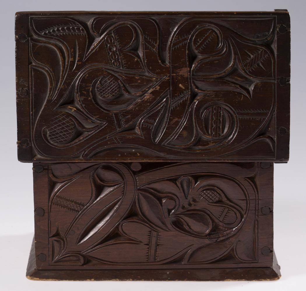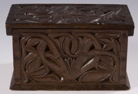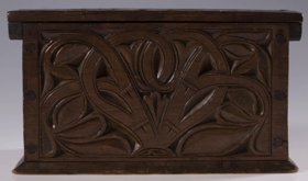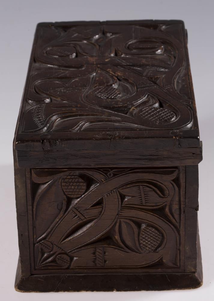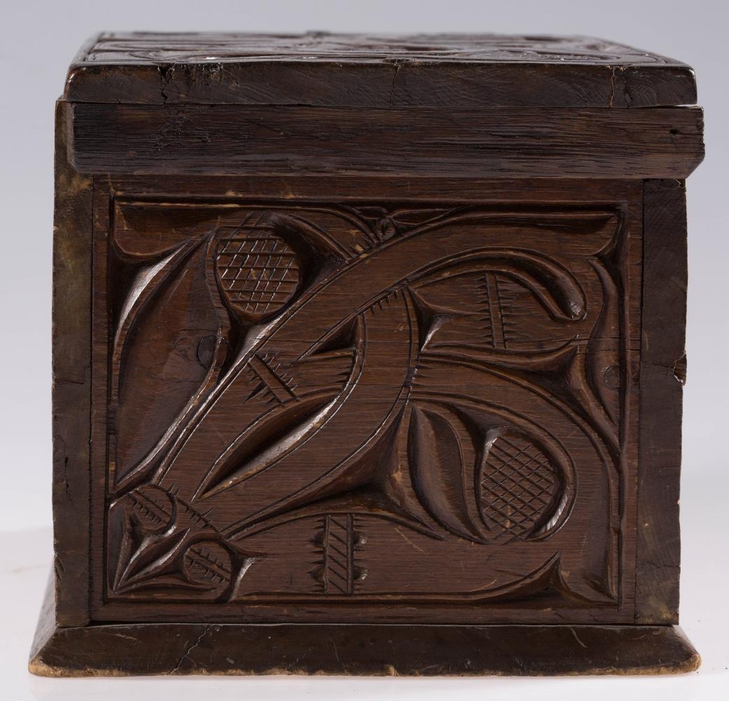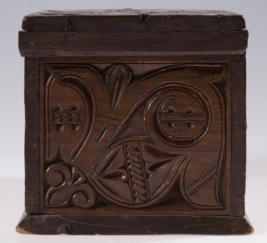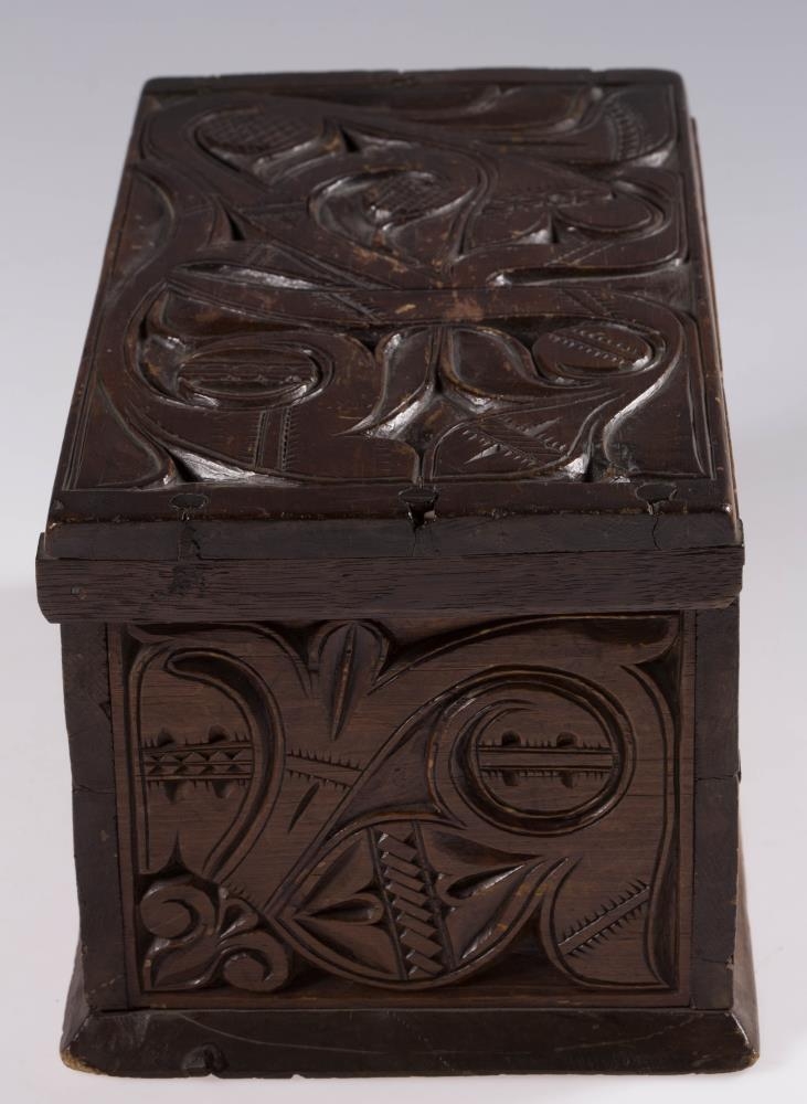 Útskorinn ferhyrndur kistill negldur með tréfleygum. Hliðarnar eru negldar ofan á botnfjölina, lokið fellur ofan á og er á hjörum. Með endum loksins eru negldar smáspýtur sem falla út yfir gaflana. Kistillinn er skreyttur á öllum hliðum og á loki og minnir munstrið á jurta- eða blómamynstur. Munstrið framan á er samhverft (symmetriskt). Kistillinn er málaður með brúnni lakkmálningu.