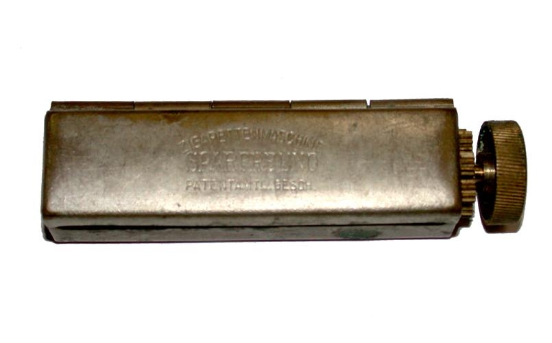 Sígarettumaskína / rúllumaskína / sígaretturúllumaskína. Til að rúlla upp sígarettur. Er úr málmi, þýsk framleiðsla. Pappírinn er lagður inn í maskínuna, tóbakið þar ofaná og svo er hnappur á endanum sem tengdur er við tannhjól þannig að þegar hnappnum er snúið þá rúllast pappírinn utanum tóbakið og úr verður sígaretta / vindlingur. Á lokið er grafið: ZIGARETTENMASCHINE SPARFREUNO PATENTAMTL.GESCH.