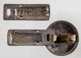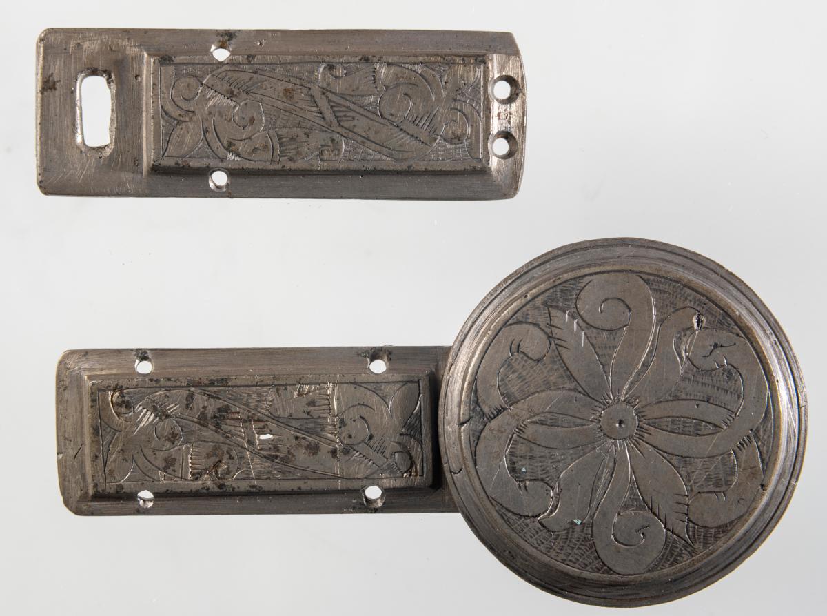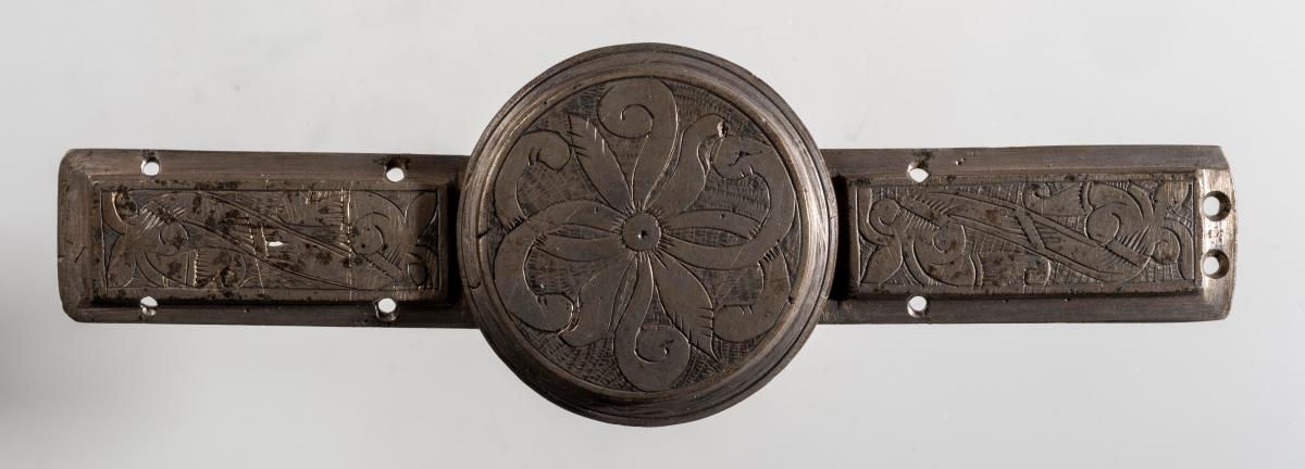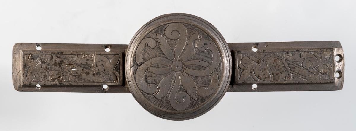 Beltispör steypt úr prinsmetalli, grafin ofan, með greina-og blaða-skrauti. Stokkarnir eru 5,7 x 2, skjöldurinn 4,2 að þverm. Sbr. nr. 2818, 4855 o. fl. -
