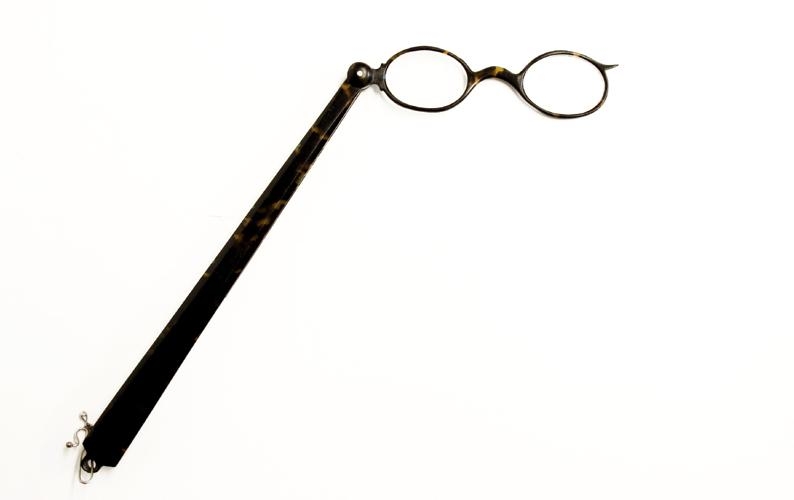 Lonníettur / gleraugu með umgerð úr plasti með skelplötuáferð og með löngu skafti úr sama efni. Lonnietturnar eru festar við skaftið með járnteini og þeim er hægt að snúa um þennan ás. Þegar þær eru ekki í notkun er þeim snúið niður og þá falla þær inn í rauf í skaftinu, sem virkar þá eins og hlíf eða hulstur um lonníetturnar. Á þeim enda lonníettanna sem fjær er skaftinu er lítið hak sem haldið er í þegar lonníettunum er snúið um ásinn. Skaftið er 20,9 cm langt og breikkar niður á við. Neðst er það 1,8 cm breitt og 0,6 cm þykkt. Lonníetturnar sjálfar eru um 10,5 cm langar (breiðar) og hæðin er 3 cm. Neðst í skaftinu hangir lítil málmlykkja með króki á.