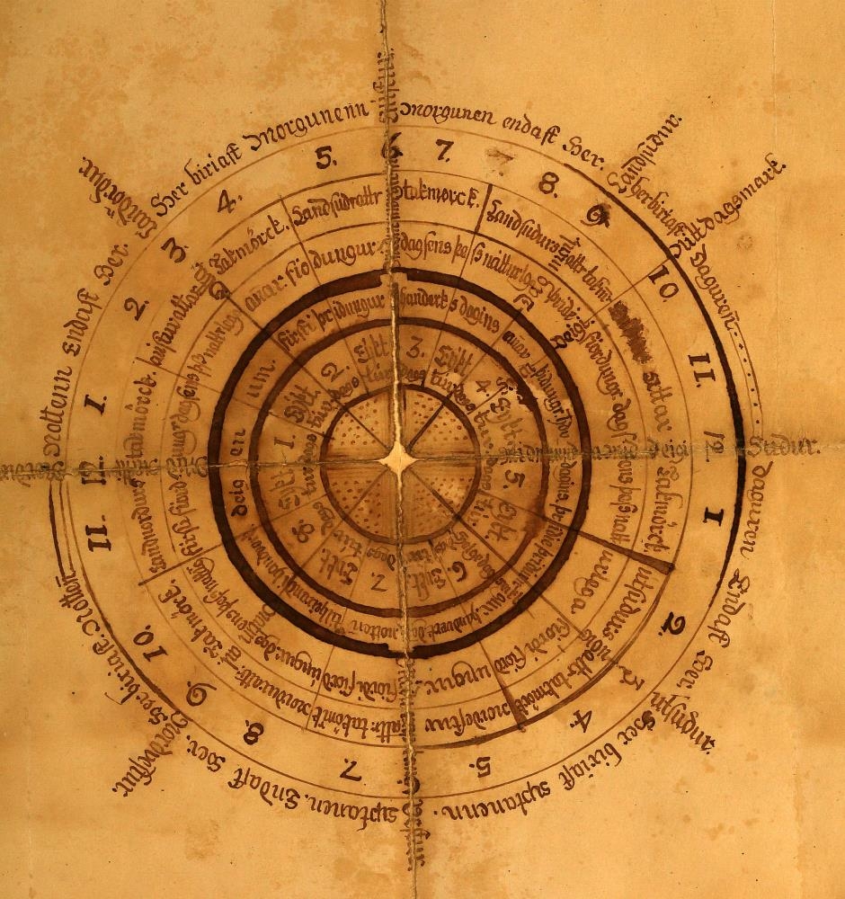 Sólskífa eins konar, kringla, dregin á blað, st. 42,3 x 34,5 cm., að þverm. 14 cm. sjálf, með strikum og nöfnum, tölustöfum og öðrum skýringum, er sýna skipting sólarhringsins í áttir og tímabil. Umgjörð eða bekkir með blómskrauti, dregnir allvel og með litum, eru til hliða og yfir, og undir er: SVEIRN:SVEINS:SON:HRAUNUM (N-in snúa öfugt. GS). Sögð af gef. dregin af Birni Gunnlögssyni kennara. - Prentuð rímtafla fyrir 1840 - 1900 fylgir með: blaðst. 39,5 x 24,4 cm. - Á umslagið hefur gef. skrifað: Sólskífu þessa bjó Björn Gunnlaugsson til þegar hann var við landmælingar í Fljótum og gaf Svein(i) í Haganesi, sem aftur gaf mjer hana.