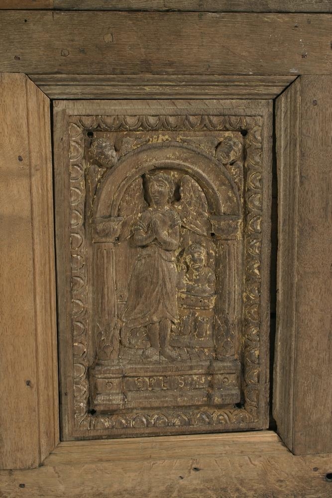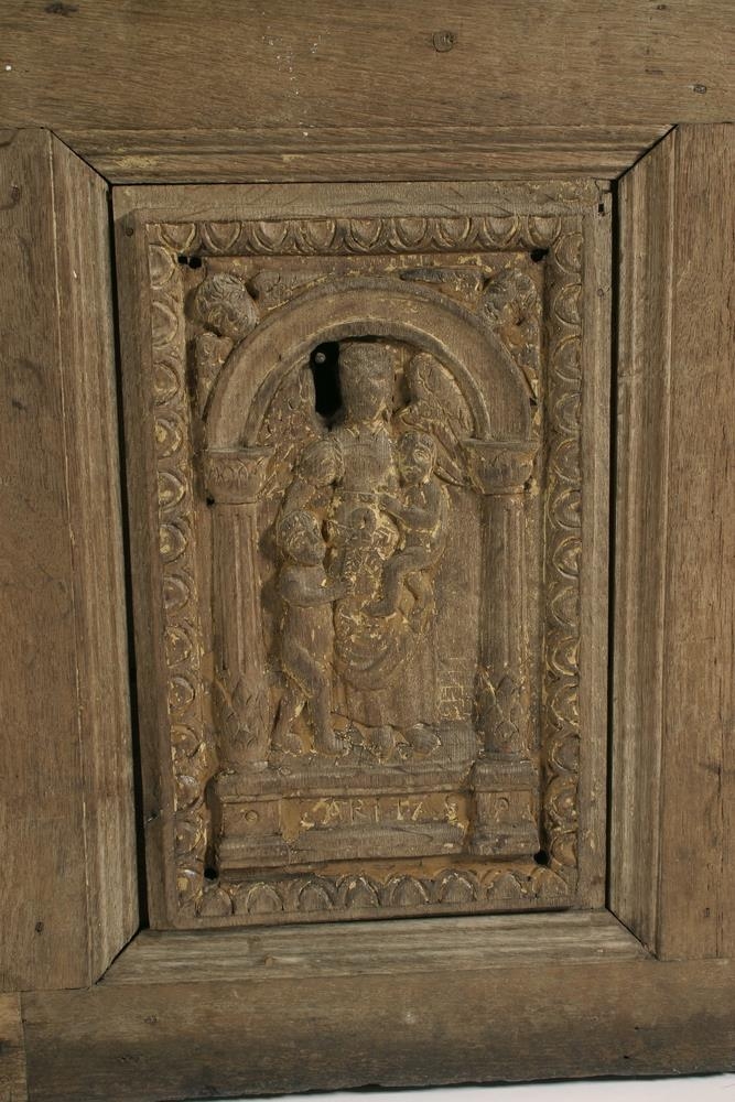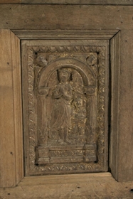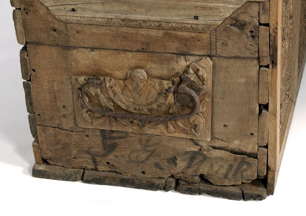 Renaissance-style chest dated (15)78, from Hamburg. The chest is said to have belonged to Páll Jónsson (d. 1598) of Staðarhóll, a wealthy district commissioner in West Iceland. Various items still exist which are said to have belonged to him. On the front of the chest are depicted three virtues, Hope, Charity and Justice, and beneath them their Latin names Spes, Caritas, Iustitia. Hope is depicted with a man sitting in the stocks, hoping for freedom, Charity with a child, and Justice with the sword of punishment and the scales of justice.