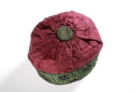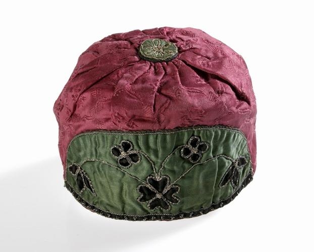 Skírnarhúfa úr rauðu, rósofnu silki með grænni, hálfkringlumyndaðri silkiburst að framan, sem er útsaumuð með silfurvír og skreytt flauelsblómum. Frá fyrri hluta 19. aldar.