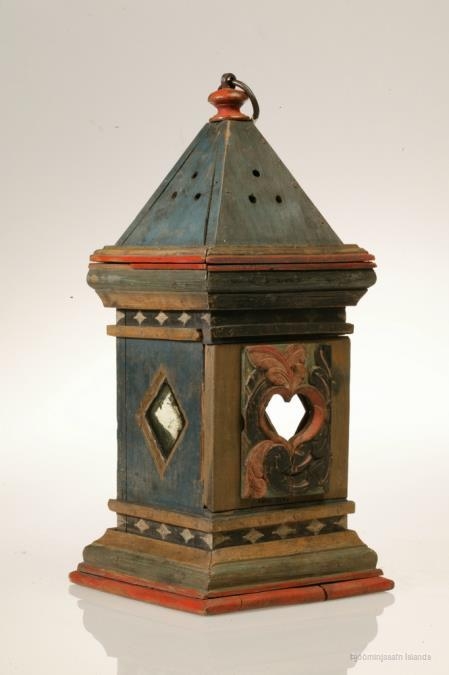 úr furu, málaður allur að utan, aðallega blár, en með grænum, rauðum og