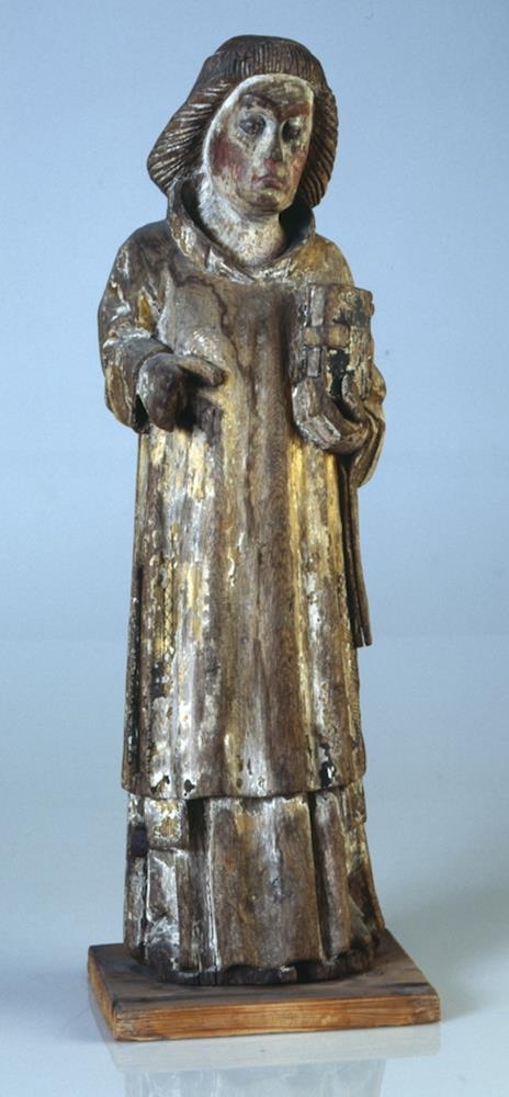 Mynd af helgum manni; hann heldur á bók í vinstri hendinni, og á að hafa haldið á skál eða kaleik í hægri hendinni, en það er dottið í burtu, og brotið framan af fingrunum: hann er í skósíðum hjúpi víðum, og öðrum þar yfir styttri, með víðum ermum, og mjóum kraga að ofan, sem stendur upp, en fellur ekki alveg að hálsinum. Þessi yfirhöfn hefir öll verið gylt: hann er berhöfðaður með nokkuð mikið hár, en krúnurakaður í kollinum. Þessi mynd er úr Múlakirkju við Breiðafjörð.