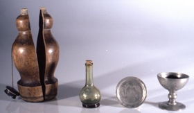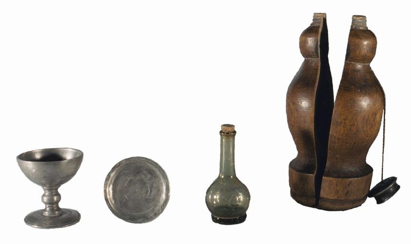 að ofan með strikuðum hringum á og til skrauts. Vínflaskan er úr