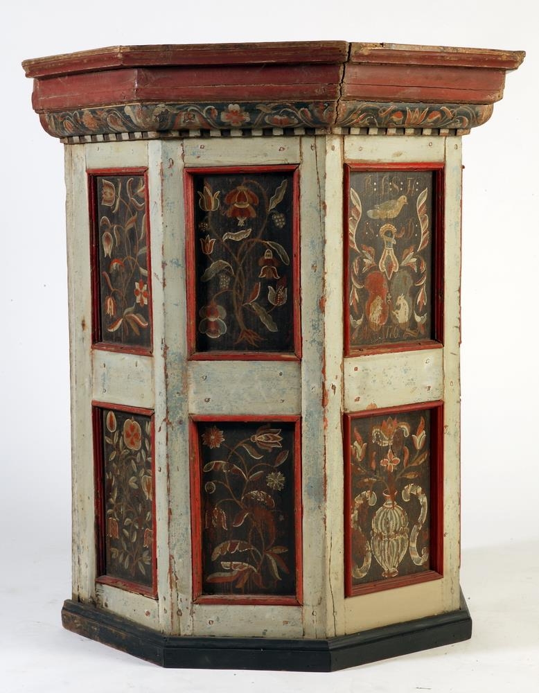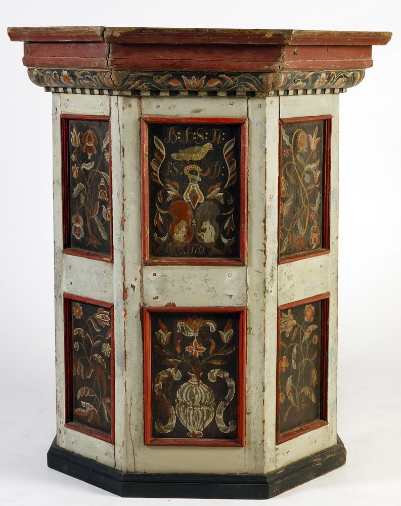 Prjedikunarstóll, smíðaður úr furu, með 5 hliðum og myndar önnurhver rjett horn við aðra frá eins og í reglulegum átthyrningi, en op er þar sem 3 hliðar væru, ef heill átthyrningur væri. Hæð 102,5 sm., br. hliðanna dálítið misjöfn: 27,5 - 32 sm. Stór brún, útstandandi, er yfir: virðist vera aukin, hækkuð. Í hverri hlið eru 2 spjöld og eru máluð blóm á þau með ýmsum litum, allvel gert: alþýðulist. Á efra spjaldinu í miðhliðinni eru 2 íslensk skjaldarmerki saman: er á öðru hálfur, gulur björn ( ísbjörn ) í rauðum feldi, og á hinu hálfur, hvítur einhyrningur í bláum feldi. Á hjálminum uppi yfir er stór fugl. Þar uppi yfir eru uphafsstafirnir B:Þ:S:H(Ætli þetta sé ekki TH samandregið þ.e.Thorlacius? KE): og J:S:D: Fyrir neðan skjaldarmerkin stendur ANO 1726 Upphafsstafirnir eru Brynjólfs Þórðarsonar, Hlíðarenda, og Jórunnar Skúladóttur, konu hans, sem var 8. maður frá Eggerti lögm. Eggertssyni, er fjekk aðalsmerkið með einhyrningnum 9/8 1488. Hitt skjaldarmerkið er naumast gamalt: kann Brynjólfur að hafa tekið það upp. Prjedikunarstóllinn var fyrst í Hlíðarenda-kirkju, en fór svo í Keldnakirkju, líklega 1802, er Hlíðarendakirkja var af tekin. Umhverfis spjöldin eru hliðarnar gráar nú en hafa fyrrum verið bláar og fyrst rauðar. Botninn er nú úr. Kominn frá Keldum á Rangárvöllum.