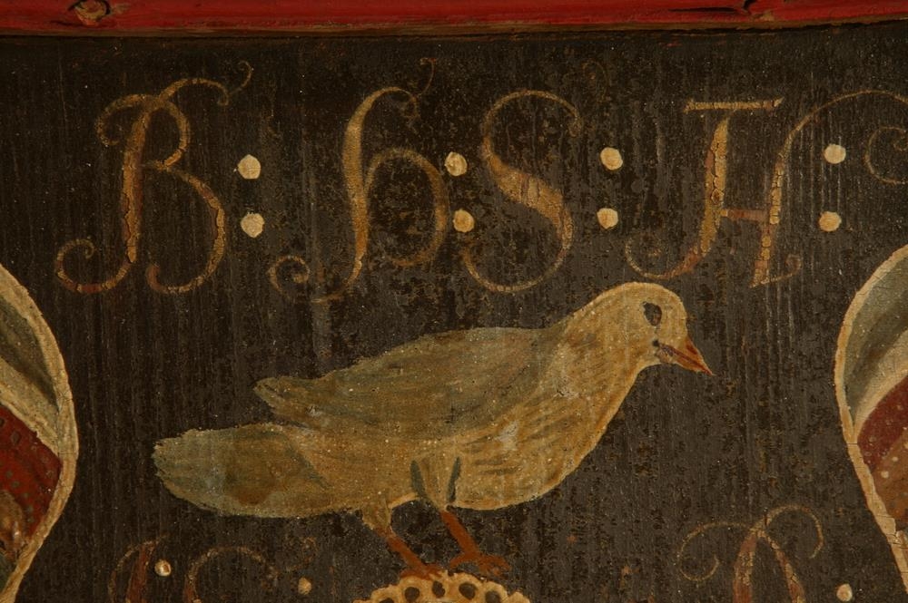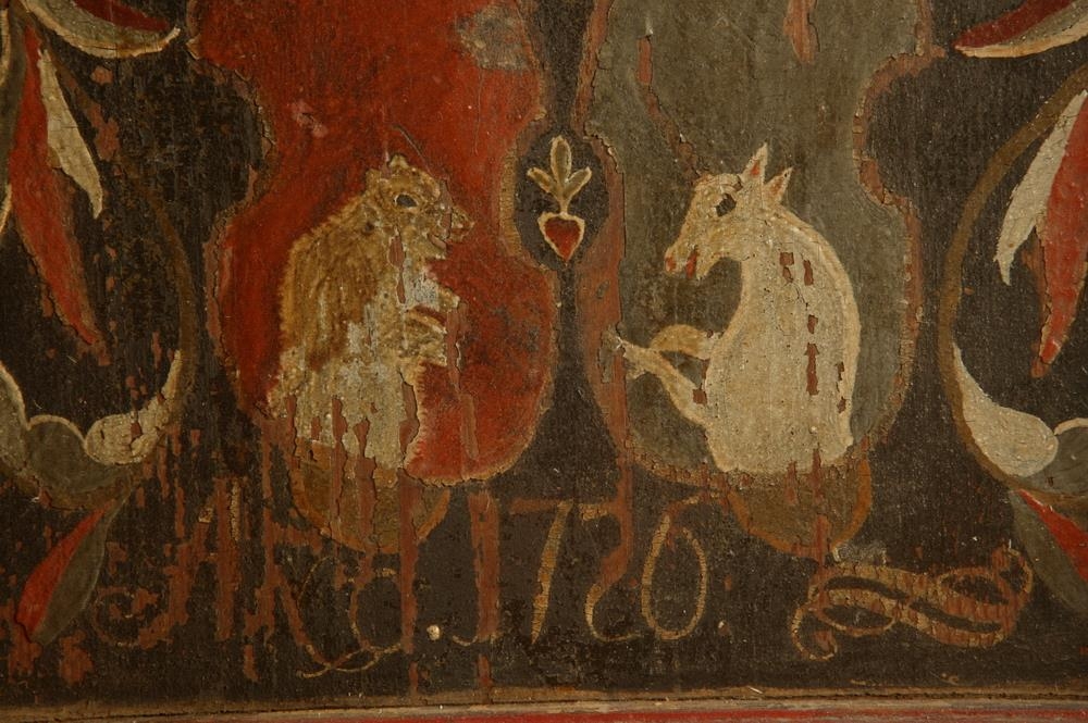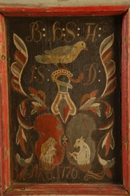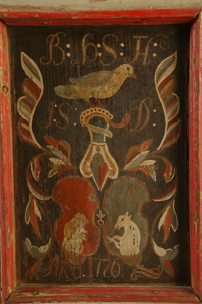 Stólinn hefur að öllum líkindum smíðað og málað séra Hjalti Þorsteinsson prófastur í Vatnsfirði við Ísafjarðardjúp árið 1726 sérstaklega fyrir þau sæmdarhjón á Hlíðarenda Brynjólf Þórðarson Thorlacius og seinni konu hans og frænku Jórunni Skúladóttur. Blómaskreytið á spjöldunum er með sama handbragði og sjá má á myndskreyttum handritum eftir Hjalta, t.d. kvæðabók séra Ólafs Jónssonar á Söndum sem Hjalti skrifaði upp. Sjá ÞK. Mynd á þili bls. 103.