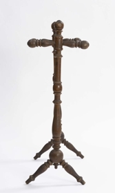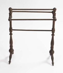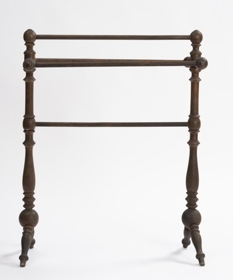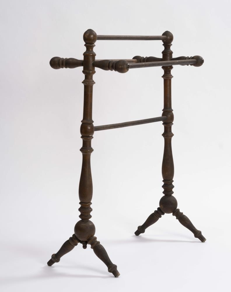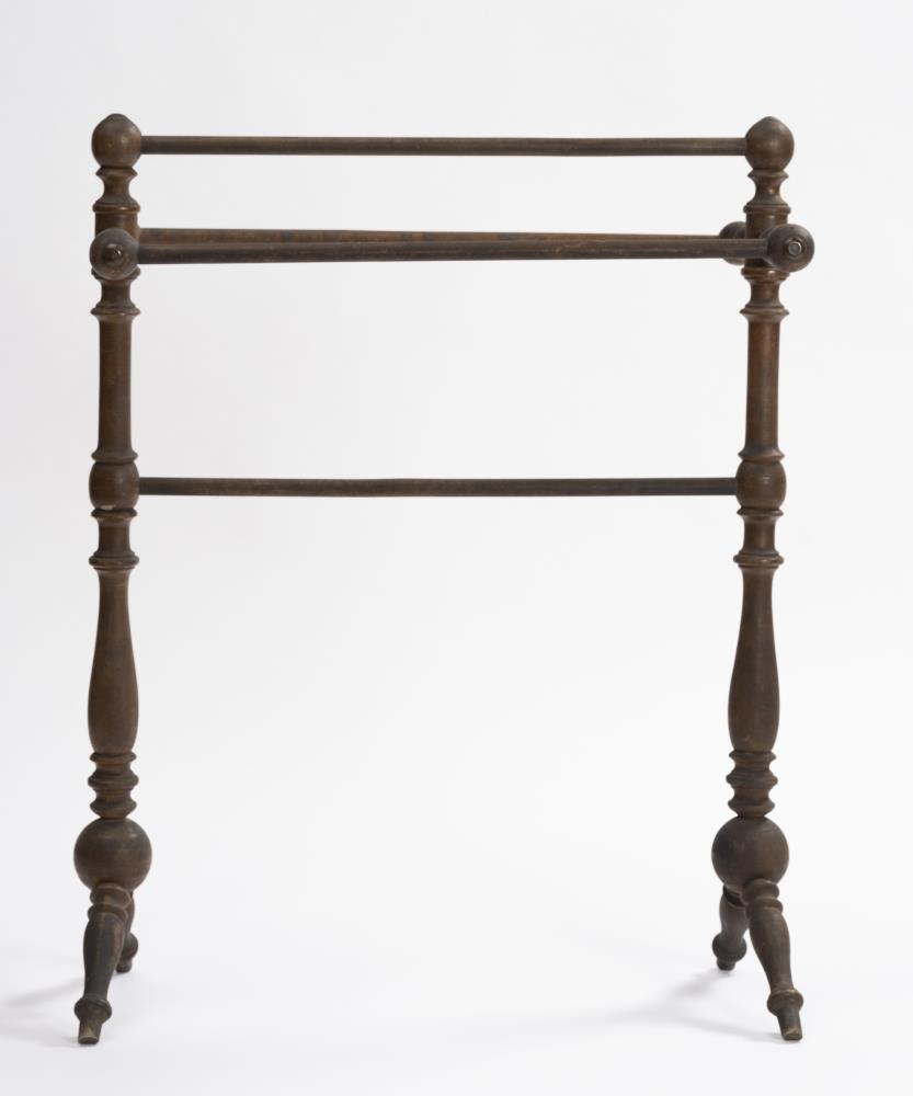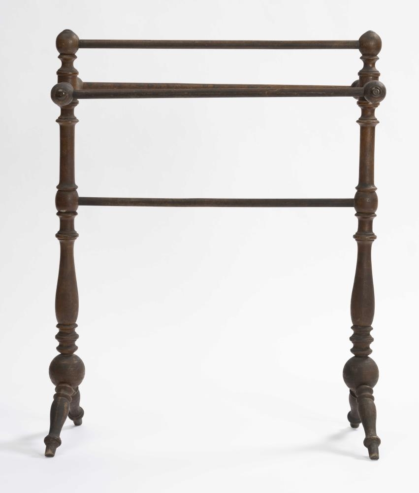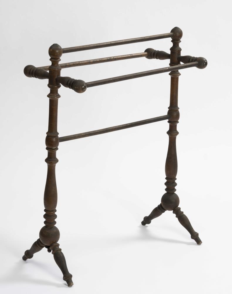 Handklæðagrind, smíðuð úr birki, rennd öll, töppuð saman og límt við samskeyti. Fjórar slár eru settar lárétt milli tveggja lóðréttra stólpa, tvær yzt á stauta, er ganga út ofarlega til beggja hliða og lárétt, ein á milli við toppana, en sú fjórða nálægt miðju, tveir fremur lágir skáfætur undir stólpum, og vita þeir þversum, eins og klakkarnir að ofan. H. grindar um 76 sm, l. um 61,5 sm og br. tæpl. 28.5 sm. Trén kringlótt í þverskurði, stólpar, stautar og fætur með upphleyptum skrautatriðum, stór kúla á samskeytum stólpa og fóta, slár sívalar. Gerðir eru knottar, hringar, tölur, sveigðar mjóddir, bumbuliðir og loks beinir kaflar. Stofnar í stólpunum tveimur um 60 sm á l., mest þvm. 4.5 sm og minnst 2.1 sm. Frá hvirfli niður að stautnum um 10 sm. Haf milli stautenda og neðri enda fóta næstum jafnt, og verður það mest um 28.5 sm. Bilið frá toppi að neðstu slá 30.5 sm. Þvm. við klakka 4 sm mest, en fætur 3.5 sm. Allar eru slár jafngildar, og þvm. um 1.6 sm. Kúlurnar, sem tengja stólpa og fætur, eru tæpl. 7 sm í þvm. Um 2.7 sm langt typpi neðan á annari, kringla með botn og lítill knotti á að framan, en á hinni gat fyrir slíkt typpi á sama stað. Á hvirflum og yzt á klökkum látúnsbóla, mun 1.8 sm í þvm. Borinn gljái á. Sjá má sprungur, gljáhúð eydd og viður og látún hafa dökknað.