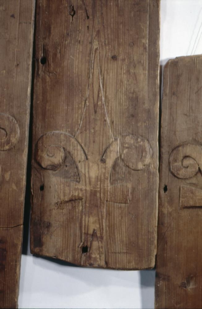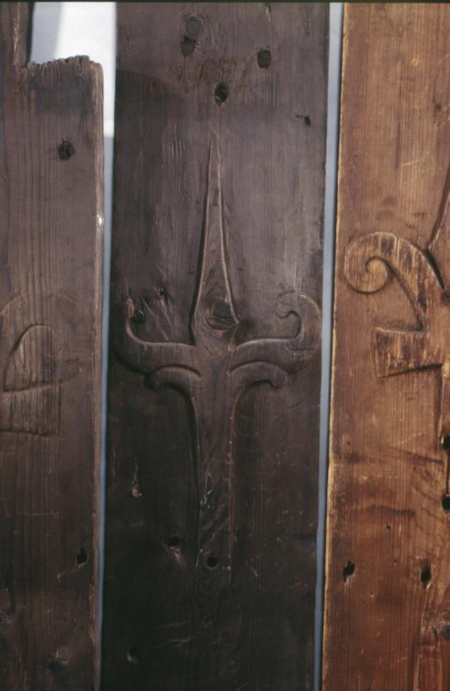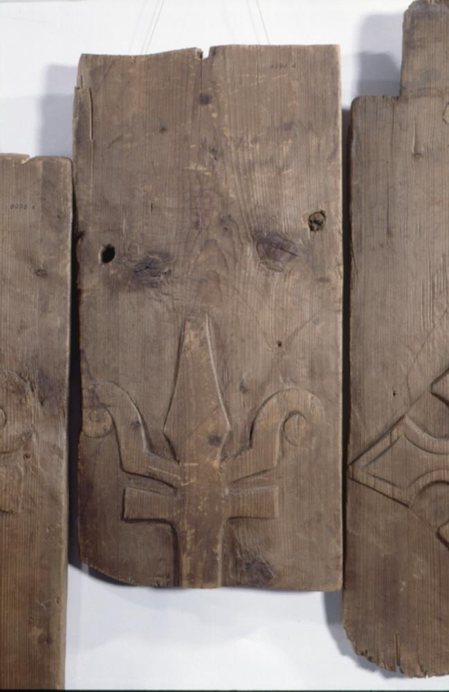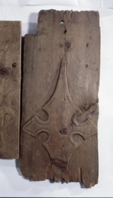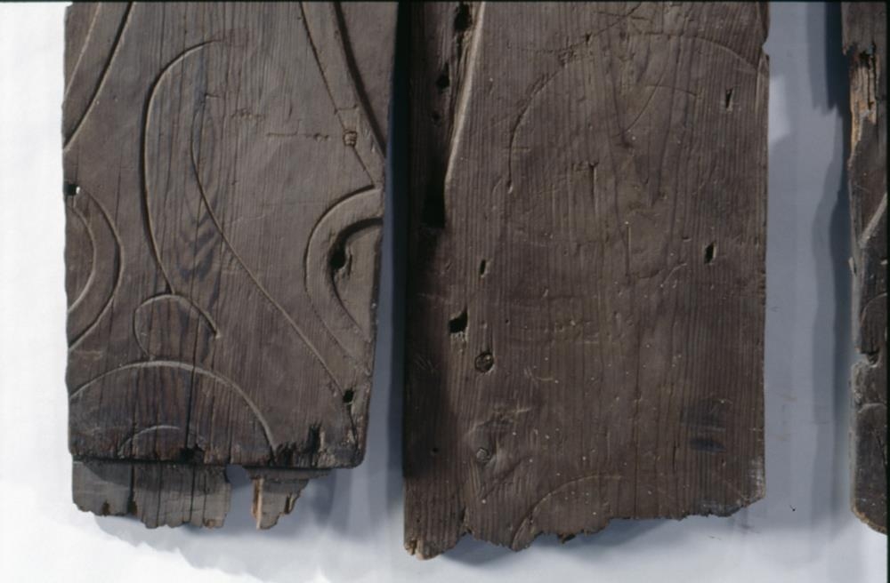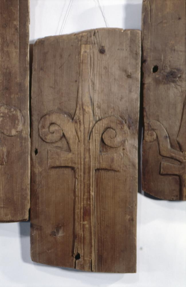 Fjalir með útskurði, fimm að tölu, fornar, úr byggingu: a, l. 140 sm. br. 27 sm, annars vegar er skorin, dálítið upphleypt, uppmjó strýta og efst á henni er sem spjótsoddur, en fyrir neðan hann ganga út beygjur eða greinar og þar neðanundir þverálma (l. 18 sm.) Neðst er skorið ofan í spíruna eins konar hnútaverk, mjög fornlegt, og vantar þar neðan af. Á þessari fjöl er aðeins lítið bil autt fyrir ofan spíruna (12 sm.) og hefur það nýlega verið sagað af endanum. Á b. er efri hluti af sams konar spíru, um 46 sm., og hefur verið sagað af þeim enda: af efri endanum hefur ekki verið sagað (nýlega) og er fjölin öll 134 sm. að l., en sljett öll fyrir ofan spíruoddinn: br. 26 sm: c. er með sams konar oddi, lítill bútur sagað af báðum endum, l. 54 sm., br. 26,: d. bútur með svipuðum oddi, nokkuð frábrugðnum: l. um 48 sm br. 25 cm. e. þriðji búturinn með frábrugðnum oddi, l.um 62 cm., br. 28 sm. Gerðin á þessum útskurði er helzt í gotneskum stíl eða svipuð honum. Ef til vill eru fjalirnar úr kirkjubyggingu í nágrenninu. Þær munu naumast yngri en frá 14.öld. (Sjá einnig Þjms. 7015 a-h, 1994-164 og 1997-26).