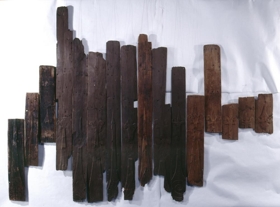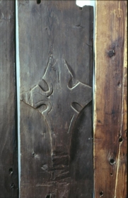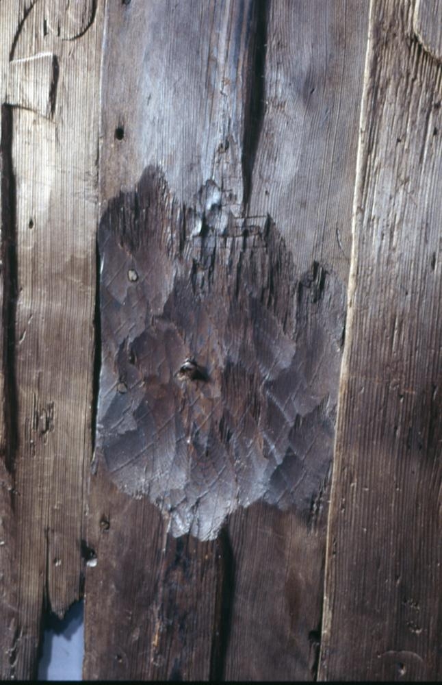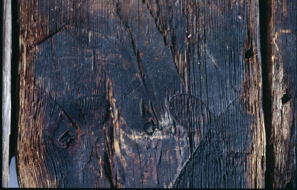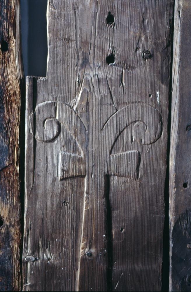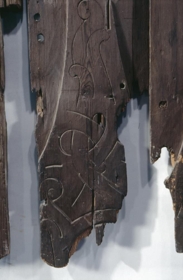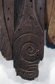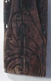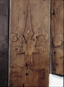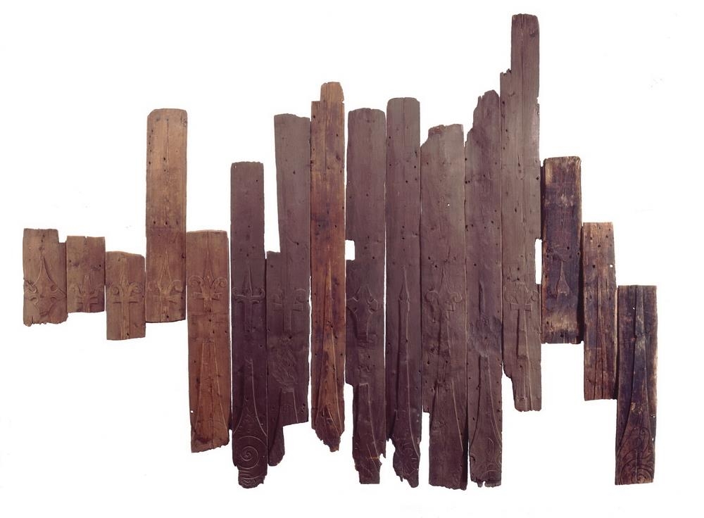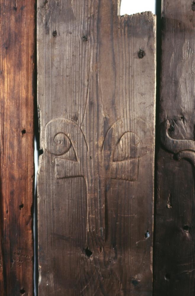 Fjalir með útskurði, fimm að tölu, fornar, úr byggingu: a, l. 140 sm. br. 27 sm, annars vegar er skorin, dálítið upphleypt, uppmjó strýta og efst á henni er sem spjótsoddur, en fyrir neðan hann ganga út beygjur eða greinar og þar neðanundir þverálma (l. 18 sm.) Neðst er skorið ofan í spíruna eins konar hnútaverk, mjög fornlegt, og vantar þar neðan af. Á þessari fjöl er aðeins lítið bil autt fyrir ofan spíruna (12 sm.) og hefur það nýlega verið sagað af endanum. Á b. er efri hluti af sams konar spíru, um 46 sm., og hefur verið sagað af þeim enda: af efri endanum hefur ekki verið sagað (nýlega) og er fjölin öll 134 sm. að l., en sljett öll fyrir ofan spíruoddinn: br. 26 sm: c. er með sams konar oddi, lítill bútur sagað af báðum endum, l. 54 sm., br. 26,: d. bútur með svipuðum oddi, nokkuð frábrugðnum: l. um 48 sm br. 25 cm. e. þriðji búturinn með frábrugðnum oddi, l.um 62 cm., br. 28 sm. Gerðin á þessum útskurði er helzt í gotneskum stíl eða svipuð honum. Ef til vill eru fjalirnar úr kirkjubyggingu í nágrenninu. Þær munu naumast yngri en frá 14.öld. (Sjá einnig Þjms. 7015 a-h, 1994-164 og 1997-26).