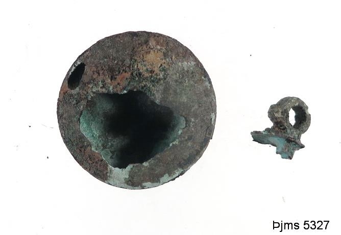 Látúnshnappur brotinn, holur innan og ávalur að ofan og neðan, þvermál 3,2 sm. Löppin brotin úr , en fylgir með. Með öskudrefjunum og spanskgrænu, komin úr brunaleifunum frá Möðruvöllum (nr. 5323 - 26).