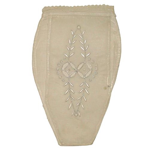 Það er úr hvítu lérefti og saumað í það mynstur með enskum og frönskum