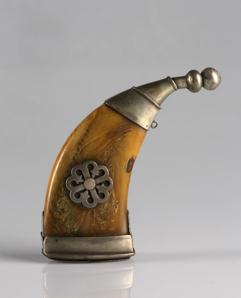 Gerð úr tönn, silfurslegin.