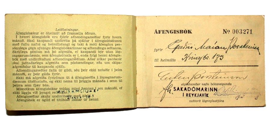 Áfengisbók fyrir karla frá árinu 1941. Kápan er gul, kjölurinn dökkblár og á kápunni stendur með svörtum stöfum: Áfengisbók fyrir karla. Hún er með númerinu 3271 og er merkt Guðna Maríoni Þorsteinssyni, Hringbraut 173 og vottuð með stimpli Sakadómarans í Reykjavík. Áfengisseðlar hafa verið notaðir fram í júní 1941. Á innanverðri kápunni stendur: