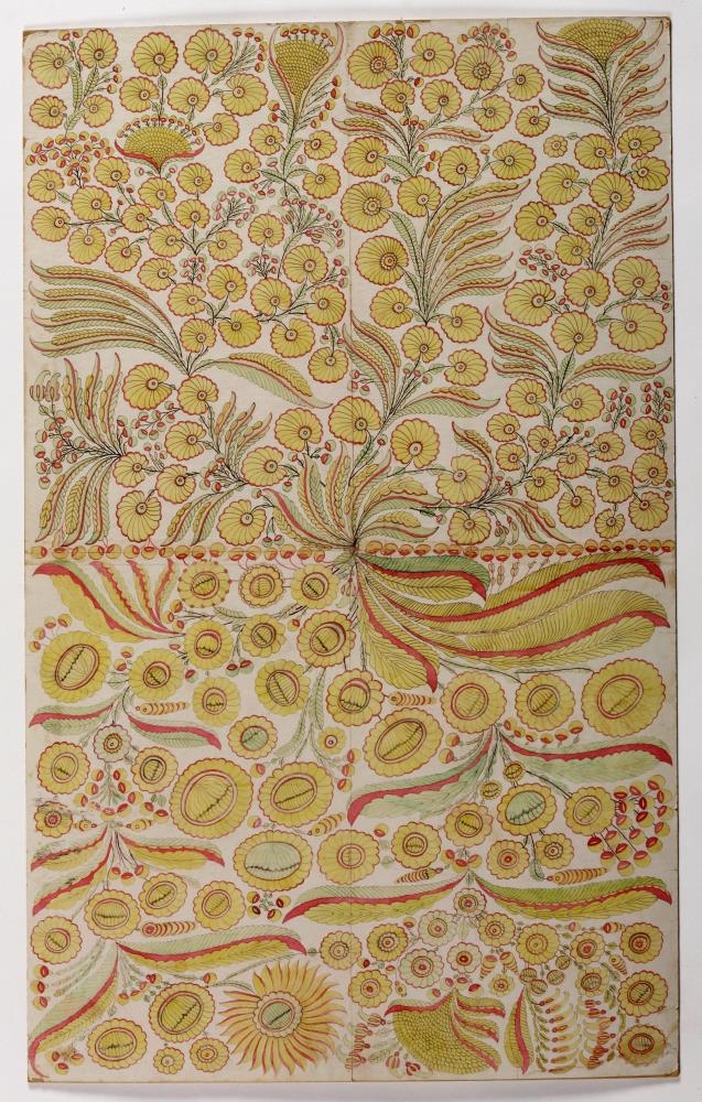 Teikning eftir Sölva Helgason, hinn þekkta umferðarmann ("flæking"), f. 1820, d. 1895. Myndin er í raun samsett af tveimur myndum sem þó tengjast á samskeytum með einskonar hnöppum. Hvor mynd fyrir sig er máluð á tvær pappírsarkir þannig að í raun er um fjórar pappírsarkir að ræða sem svo eru límdar saman á eitt pappaspjald. Á báðum myndum eru samskonar form; blóm og blómfléttur, í gulum, rauðum og grænum litum. Á bakhlið pappaspjaldsins er handskrift (ekki þó skrift Sölva, þar sem myndin er kölluð: Gular rósir. Litirnir eru líklega vatnslitir sem Sölvi hefur útbúið sjálfur. Myndin er í góðu ástandi og litirnir skærir og fremur lítið upplitaðir. Örlítið hefur rifnað af pappírnum á hornum og í einu horninu er örlítil rakaskemmd. Annars er myndin í góðu ástandi.