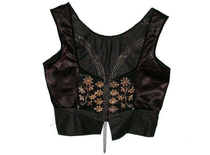 Upphlutur úr svörtu satíni með upphlutsborðum úr svörtu flaueli. Á þá eru saumaðar átta víravirkismillur úr gylltu silfri. Til hliðar við þær er saumað blómaskraut, samskonar og millurnar, þ.e. víravirki úr gylltu silfri. Í millurnar er þrædd keðja/reim og á enda hennar er reimarnál úr silfri, snúin. Í hálsmáli og handvegum eru bryddingar úr svörtu flaueli. Í bakið eru leggingar úr tvöföldum gylltum borða (vírstímur/vírsnúrur) með mjóum, svörtum flauelsborða í milli. Að aftan er hneppslulisti með þremur hnappagötum til að hneppa upphlutsbolinn við pilsið. Upphluturinn er í mjög góðu ástandi. Á saumum á bakstykki má sjá að hann hefur verið víkkaður. Upphlutsborðarnir að framan eru orðnir lítið eitt eyddir neðst þar sem þeir hafa núist við pilsstrenginn.