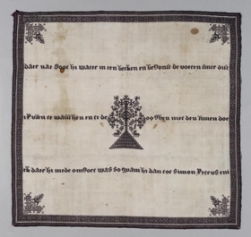 Dúkur úr hvítu lérefti, ferhyrndur, 44 x 47 cm. að stærð, með útsaumuðum bekkjum við jaðra, blómum í hornum, lífsins(?) tré á miðju og dýramyndir hjá: ennfremur er saumuð í hann svofeld áletrun á hollenzku í 3 línum með gotnesku smáletri: >> daer nae goot hi water in een becken en begonst de voeten siner disc\ipulen te wasschen en te drooghen met den liinen doc\ck daer hi mede omgort was so quam hi dan tot Simon Petrus eni <<, ritningargrein úr Jóh. guðspj., 13. kap. 5. v.: hjá trénu eru stafirnir t og f. Dúkur þessi var fyrrum í eigu Hannesar byskups Finnssonar: síðar átti hann sonardóttir hans, frú Valgerður á Hofi. Líklega handlína.