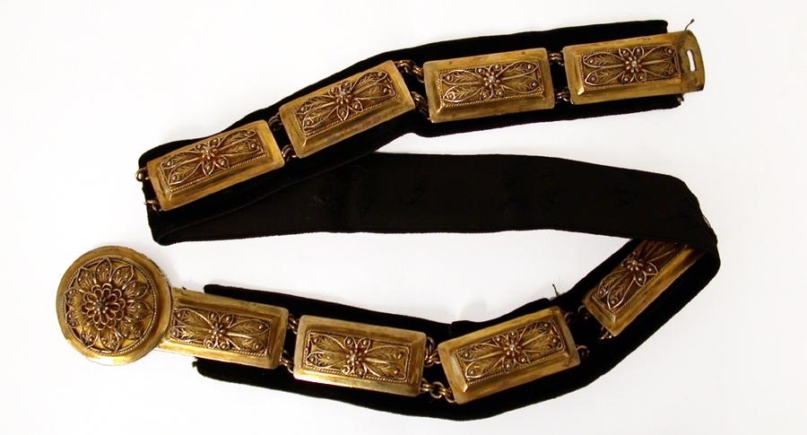 Stokkabelti þar sem stokkarnir eru saumaðir fastir á linda sem er svört teygja með flauelsáferð á þeirri hlið sem snýr að stokkunum. Stokkarnir, sem eru úr gylltu silfri, eru með kornsettu víravirki (loftvirki). Þeir eru 11 talsins, að parastokkunum meðtöldum. Þeir eru ýmist fastir saman með hlekkjum eða hlekkirnir hafa verið leystir sundur og stokkarnir þá eingöngu saumaðir fastir á lindann. Paraskjöldurinn er hringlaga og er með samskonar víravirki og stokkarnir. Beltið er í góðu ástandi.