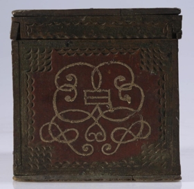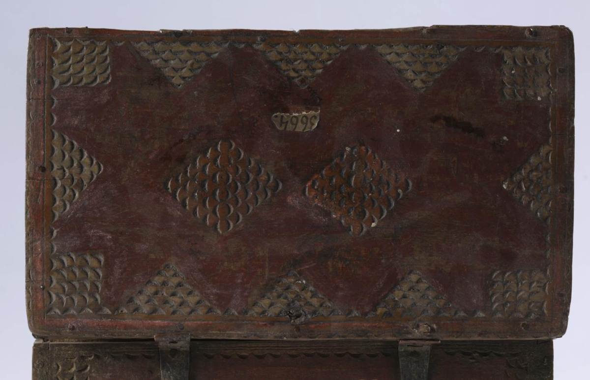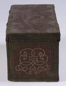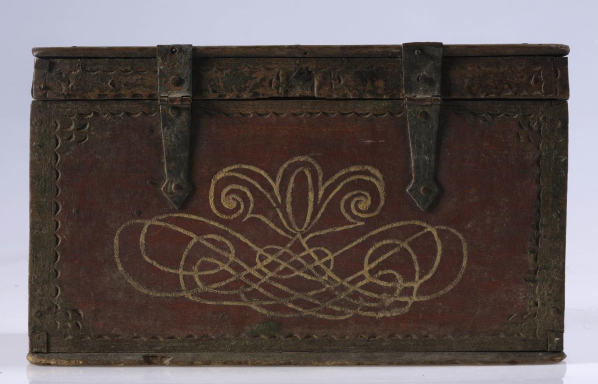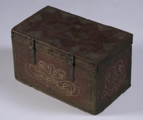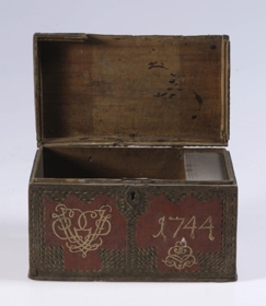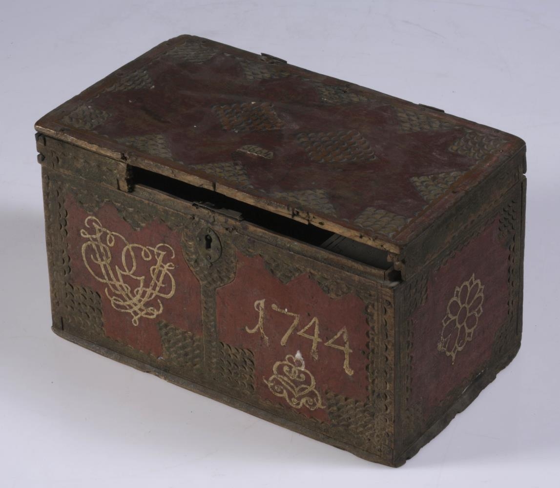 Kistill smáskorinn með laufum og tíglum: hann er málaður rauður, en grænn utan með í kring: á hann eru og dregnar rósir með gulu og á framhliðini er samandregið G J D. 1744. Kistillinn er með eirlömum og látúnsskrá bilaðri. Hann er 28 cm. yfir lokið á lengd.