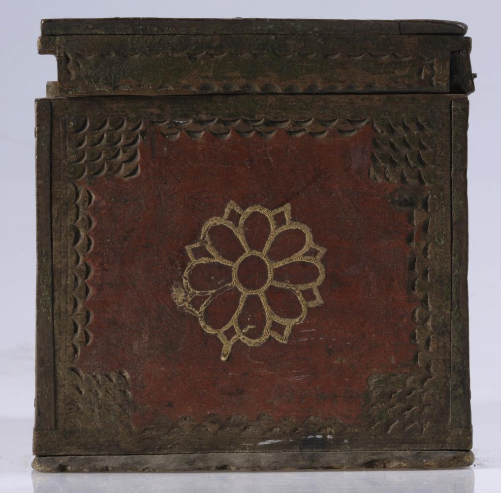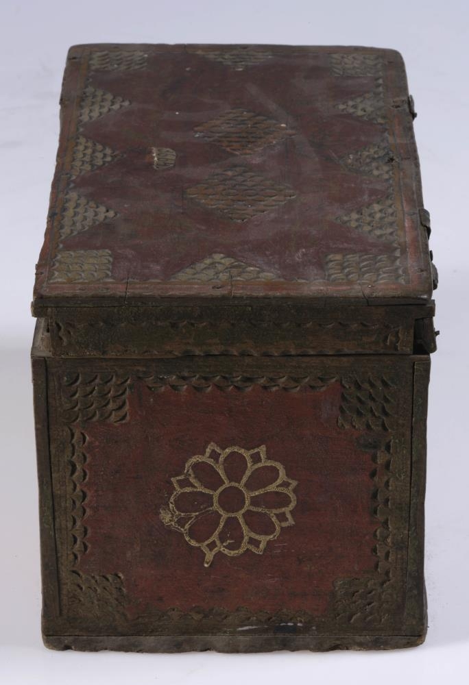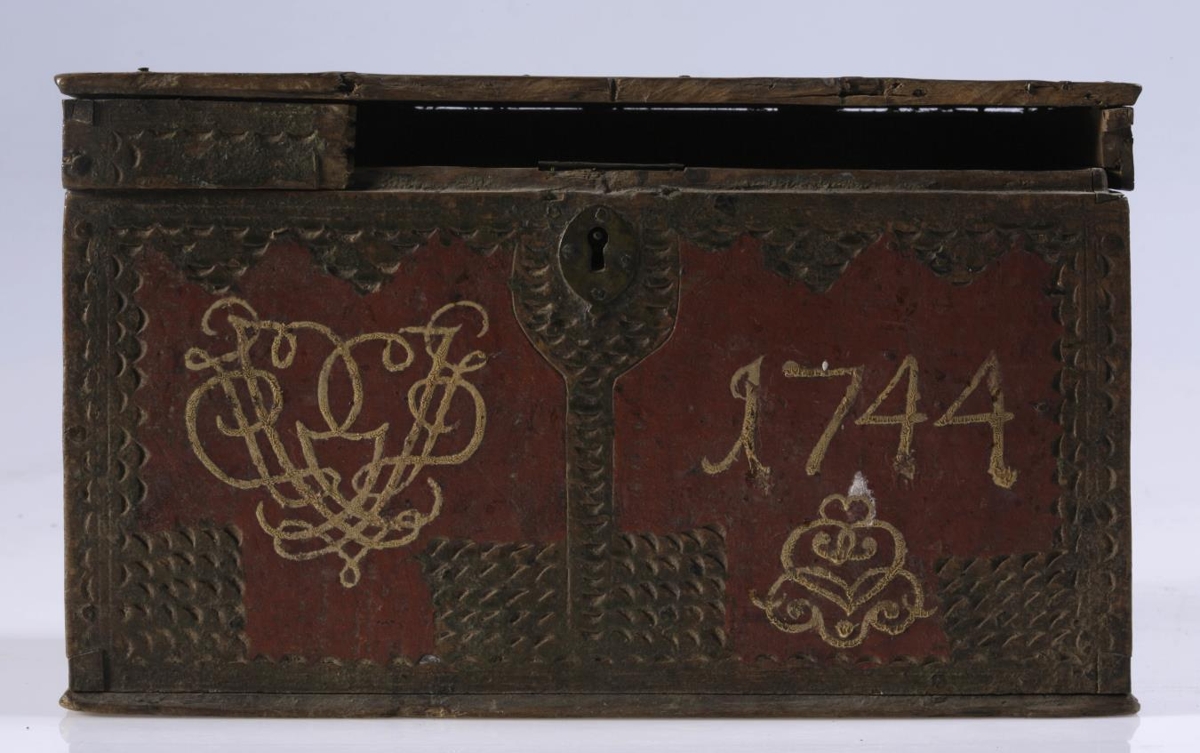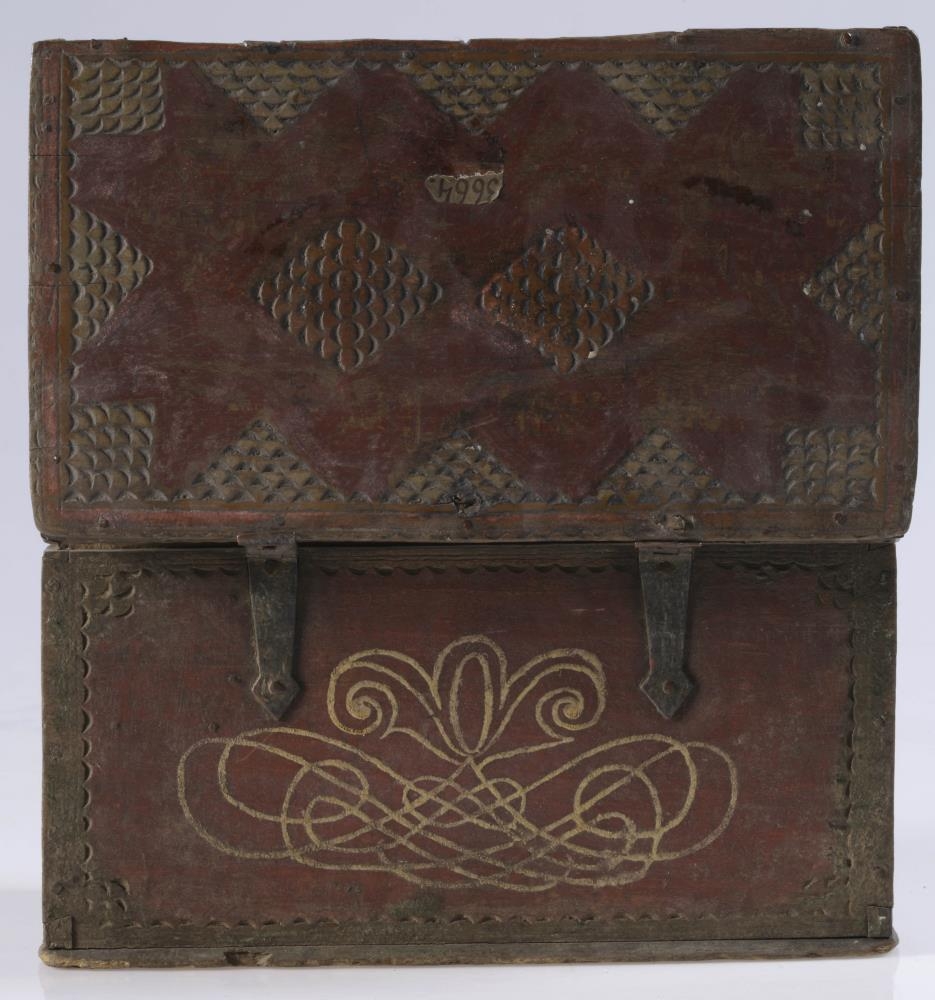 Kistill smáskorinn með laufum og tíglum: hann er málaður rauður, en grænn utan með í kring: á hann eru og dregnar rósir með gulu og á framhliðini er samandregið G J D. 1744. Kistillinn er með eirlömum og látúnsskrá bilaðri. Hann er 28 cm. yfir lokið á lengd.