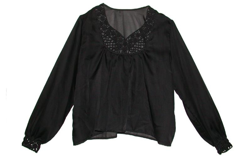 Upphlutsskyrta (blússa) úr þunnu, svörtu krepefni. Hún er með opnu brugðninga- og vafningamunstri með hálsmáli og fremst á ermum. Ermarnar eru smelltar fremst með tveimur smellum hvor. Við afhendingu skyrtunnar fylgdu þær upplýsingar að kona í Hafnarfirði hefði saumað hana. Að öllum líkindum hefur það verið Jóhanna Guðmundsdóttir, saumakona í Hafnarfirði (f. 1914, d. 1993). Hún saumaði margar samskonar skyrtur (sbr. upplýsingar við safngrip nr. Þjms. 1980-4). Skyrtan fylgir búningunum nr. 2008-25 en er yngri en margir hlutar þeirra.