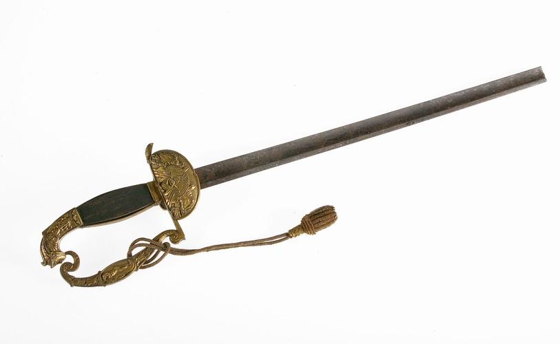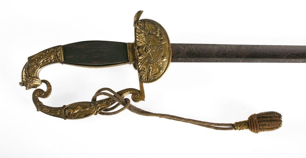 og fetil. Handfangið er úr messing og gylt, með upphleyptu verki: