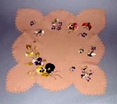 blóm og þrjú fiðrildi með svo kölluðu kúnstbródereíi eða listsaumi í mörgum
