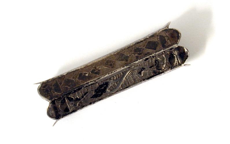 Sexhyrndur skúfhólkur úr silfri. Á þremur hliðarflatanna er munstur myndað af sjö tíglum í röð en á hinum þremur er sérkennileg blómflétta að því er virðist. Hver flötur endar í sveig og sveigist endinn aðeins út á við. Ekki er að sjá neina silfurstimpla á skúfhólknum. Mjög er fallið á silfrið en hólkurinn er annars í góðu ástandi.