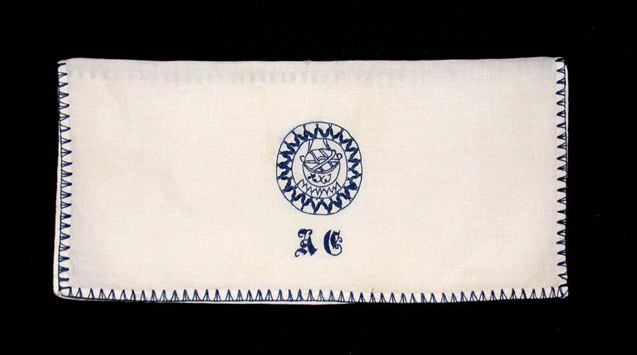 Saumað er með brúnum með bláu garni. Á framhlið er saumað merki Hússtjórnarkennaraskóla