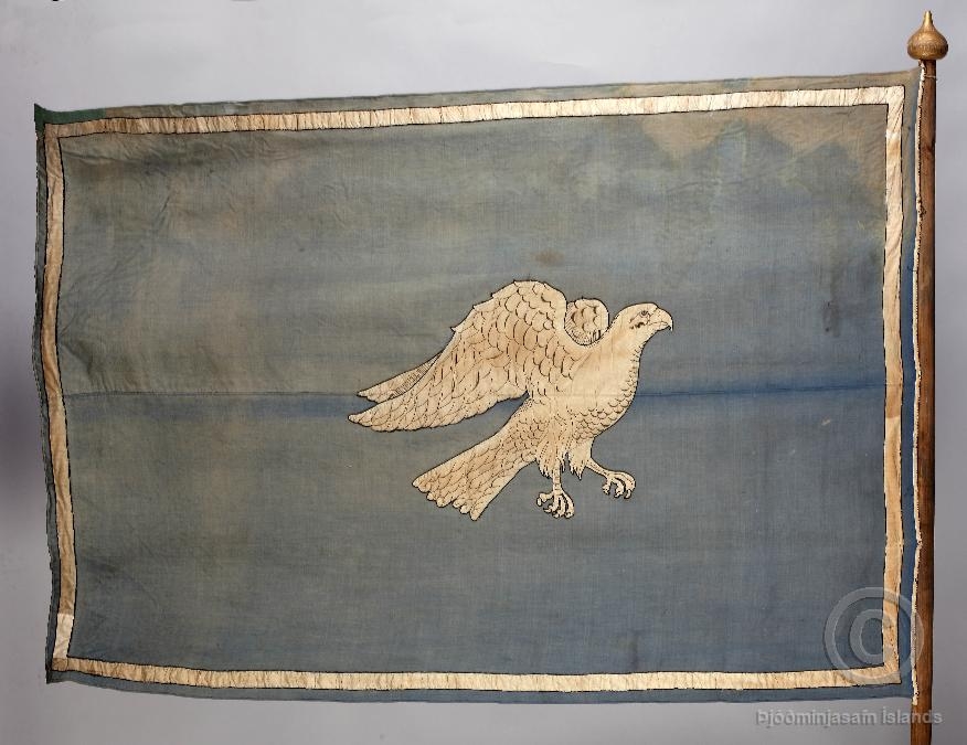 Skrúðgöngumerki á stöng, blátt með hvítum fálka á flugi (þ.e. merki Íslands samkv. frumteikningu Sigurðar málara Guðmundssonar), saumað af frú Ingibjörgu Johnson í Rvík. Gylt lýra er efst á merkisstönginni.