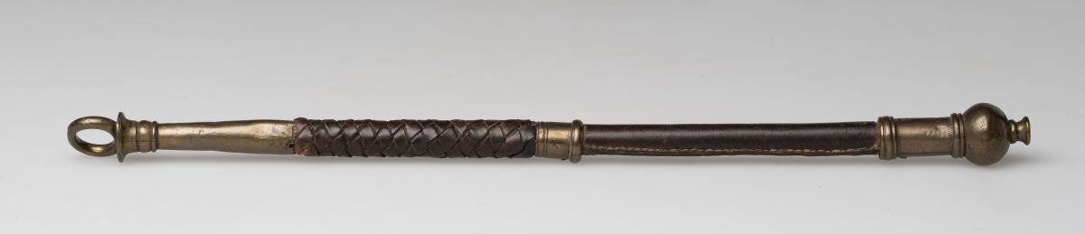 Kvennsvipa látúnsbúin, gömul: tilheyrði ömmu seljanda, Hildi Gunnarsdóttur: smíðuð af Guðmundi Magnússyni í Helludal um miðja 19. öld. Skaptið er úr,. útlendu keyri, klætt skinni. Látúnshólkar á endum og miðju. L. 36,2, þverm. 1-1,5. Á smátyppi, sem er aptaná hnúðnum, er grafið H. Ólina vantar.