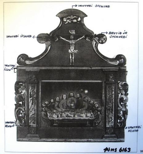 Altaristafla útskorin og máluð eptir Ámunda Jónsson og stendur letrað á hana giórt A.J.S. Á sjálfri töflunni er kvöldmáltíðarmynd afarilla máluð,. en á bríkinni upp af er krossfestingarmynd. Hæð 126 cm.: br. 108 cm.