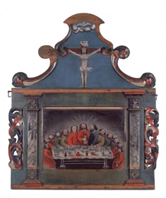 Á aðaltöflunni er sýnd hin heilaga kvöldmáltíð Krists og lærisveinanna, en á burst yfir er Kristur á krossinum og vængjaður engill efst. Kvöldmáltíðarborðið er sýnt með hefðbundnum hætti. Kristur situr fyrir miðju og stafar geislum frá líkama hans. Jóhannes situr ungur og skegglaus honum á hægri hönd, en Pétur úfinn og skeggjaður með spurnarsvip á þá vinstri. Júdas situr lengst niðri við borðsendann hnipinn með peningapunginn. Málverkið á töflunni er fremur bernskt og stirt í útfærslu, en skurðverkið umhverfis er ekki með neinum viðvangisbrag. Þar er Ámundi bersýnilega í essinu sínu.