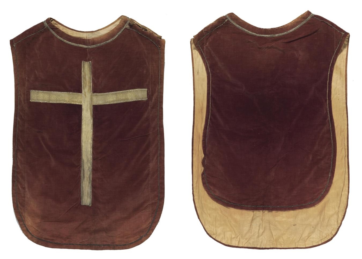 Rauður hökull með gullvírsborðakrossi. Mjór gullvírsborði nærri brún í hálsinn og einfaldari legging er utan með höklinum. Hneppt með þremur hnöppum á hægri öxl. Flauelið er orðið mikið upplitað og ljóst fóður innan í er orðið gult. Langt er síðan hökull þessi var notaður.