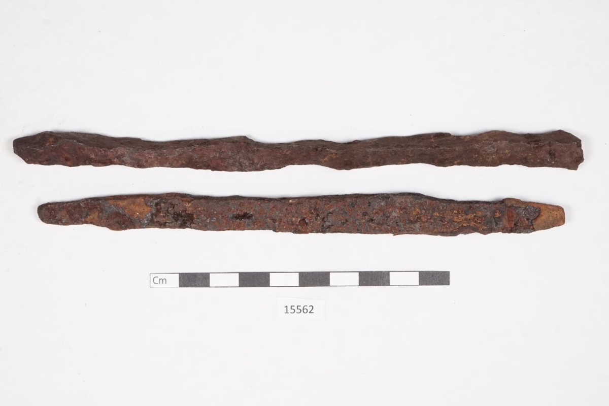 á l., br. mest 1.4 sm, l. hinnar um 18.1 og mest br. um 1.1 sm. Alryðgaður,