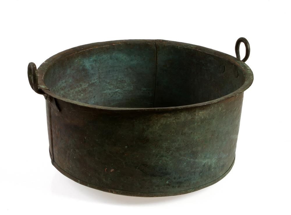 Með spanskgrænuhúð, barmur á c sprunginn á tveimur stöðum, eru flögur lagðar undir og sest með hnoðnöglum, annað eyrað skakkt á stærra potti.