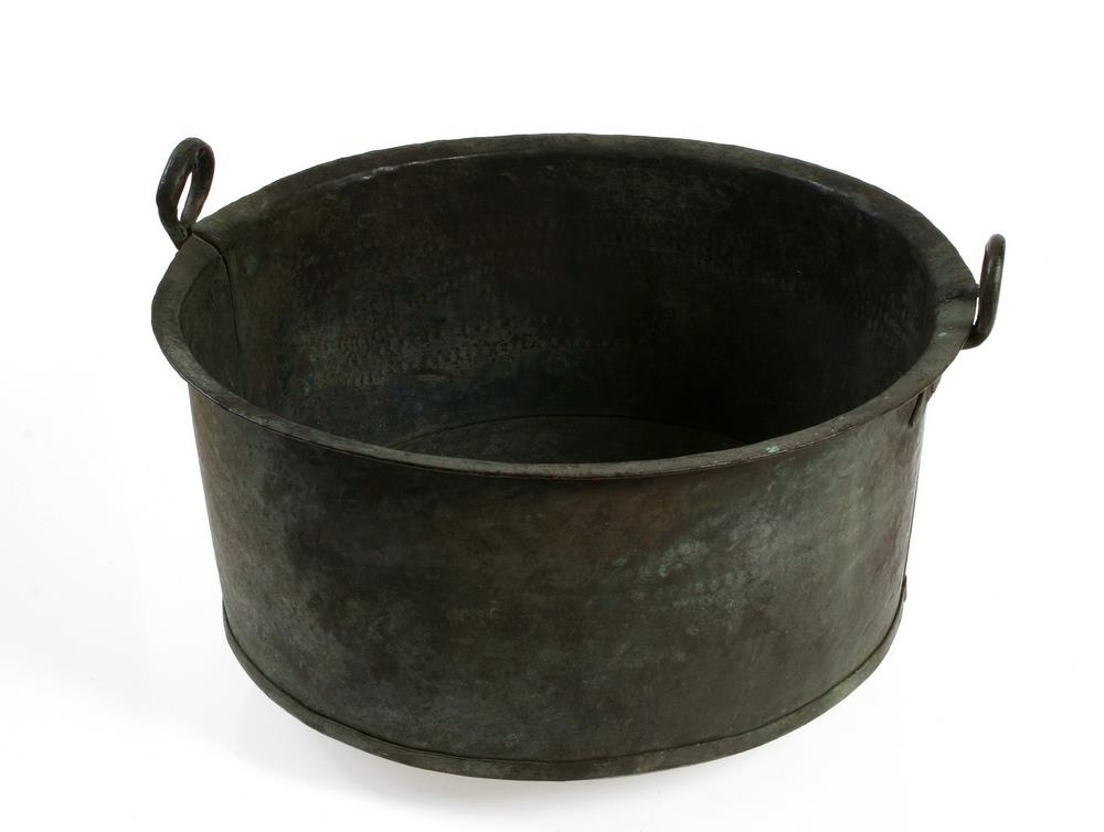 Með spanskgrænuhúð, barmur á c sprunginn á tveimur stöðum, eru flögur lagðar undir og sest með hnoðnöglum, annað eyrað skakkt á stærra potti.
