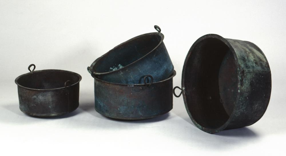 Fjórir eirpottar, af sömu gerð, fundnir saman. Eru þeir 38,7 sm til 56 sm að þvm., og má sitja hvern innan í annan, allir smíðaðir úr þremur þynnum, tvennar í hliðum og ein í botni, við barmana beyðgur á faldur, krækt saman og slegið að, en samskonar faldur við barma að utan og gerð all breið rönd. Pottarnir víkka örlítið upp, hliðar sléttar og botn kúptur. Tvö eyru á , sem rísa að kalla beint upp hvort gegnt öðru og undan barminum að utanverðu, þau gerð úr sveigðum teini og endar flattir, með laufsniði og hnoðnagli gegn, eru eyru öll við plötuhjara, nema á stærsta pottinum, þar aðeins annað.